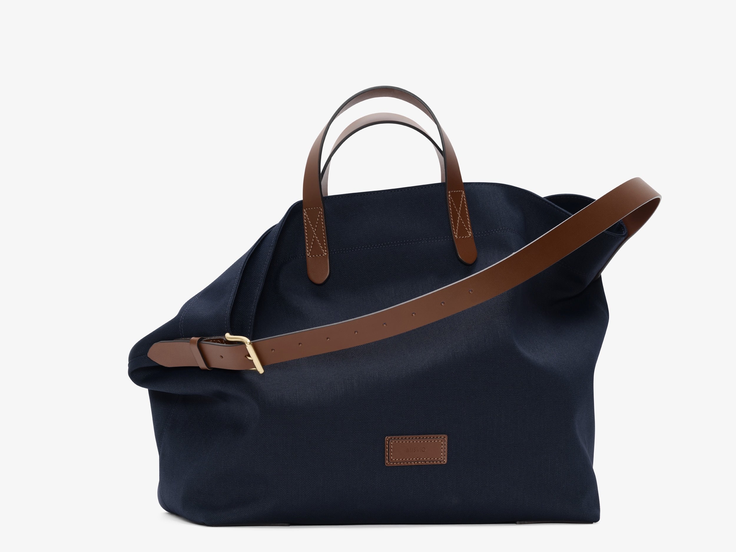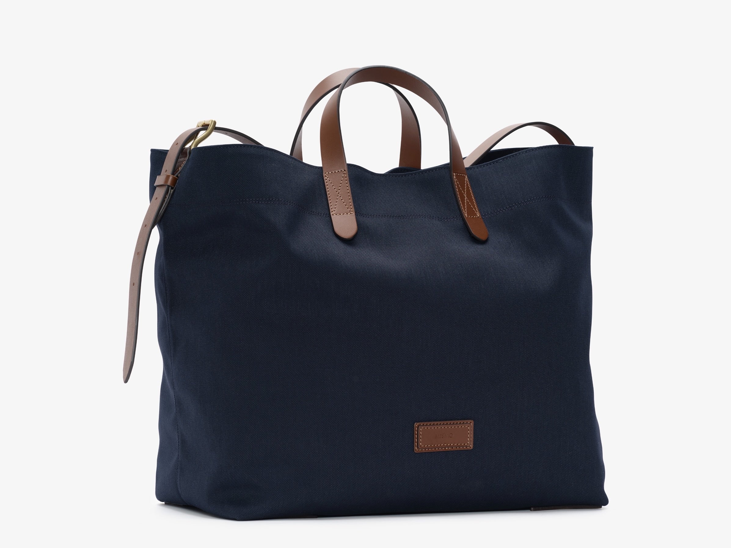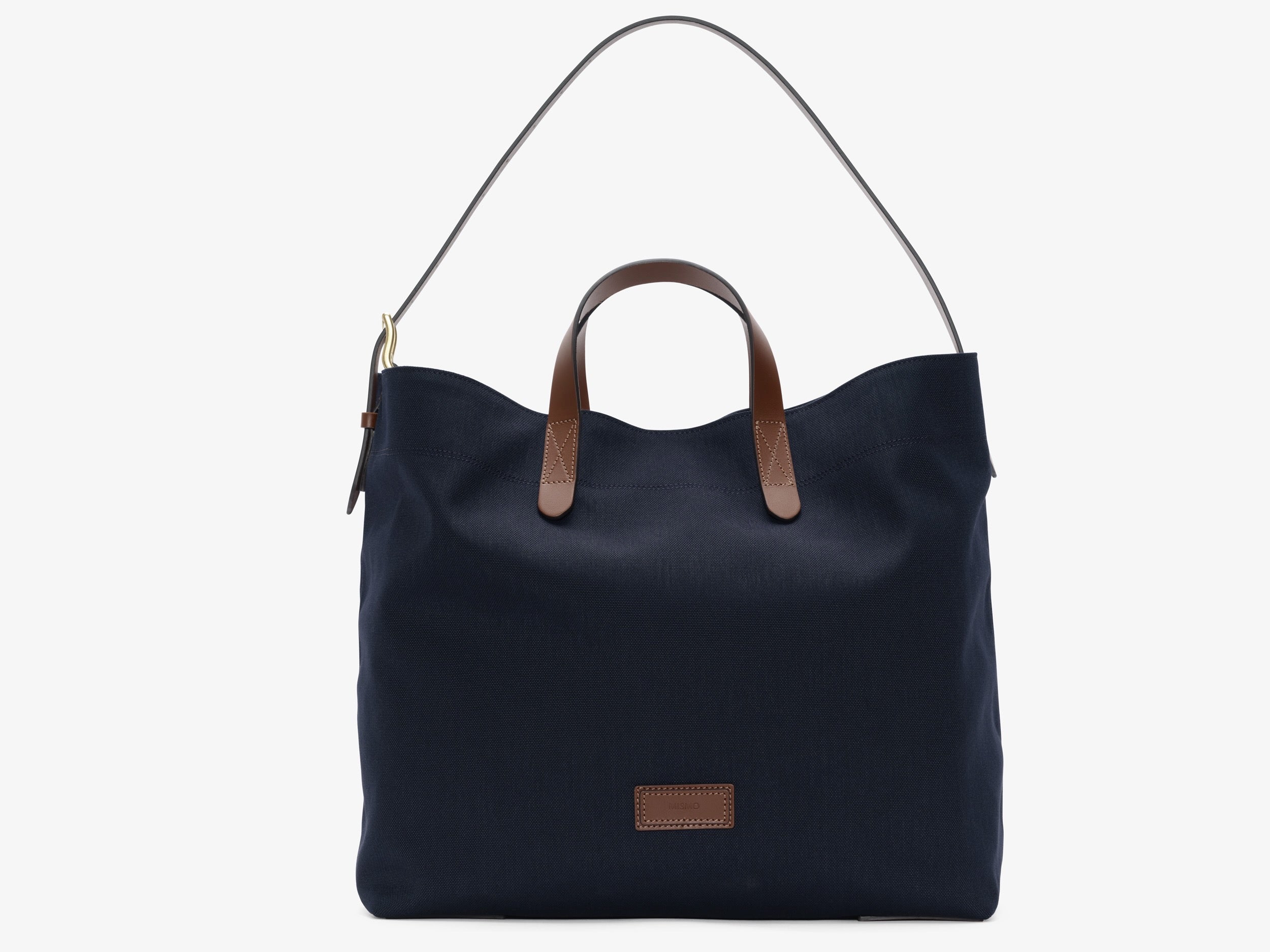 A deep navy canvas with a composed and enduring character. The tone holds a quiet depth, somewhere between classic maritime references and a more contemporary, urban restraint. Woven in Italy from a blend of cotton and nylon yarns, the fabric combines the natural tactility of cotton with the added strength and resilience of nylon. The result is a canvas that holds its structure while maintaining a soft, refined drape - suited for daily use across changing settings. Finished with a water-repellent treatment, the surface resists light rain and everyday exposure, while developing a subtle patina over time.