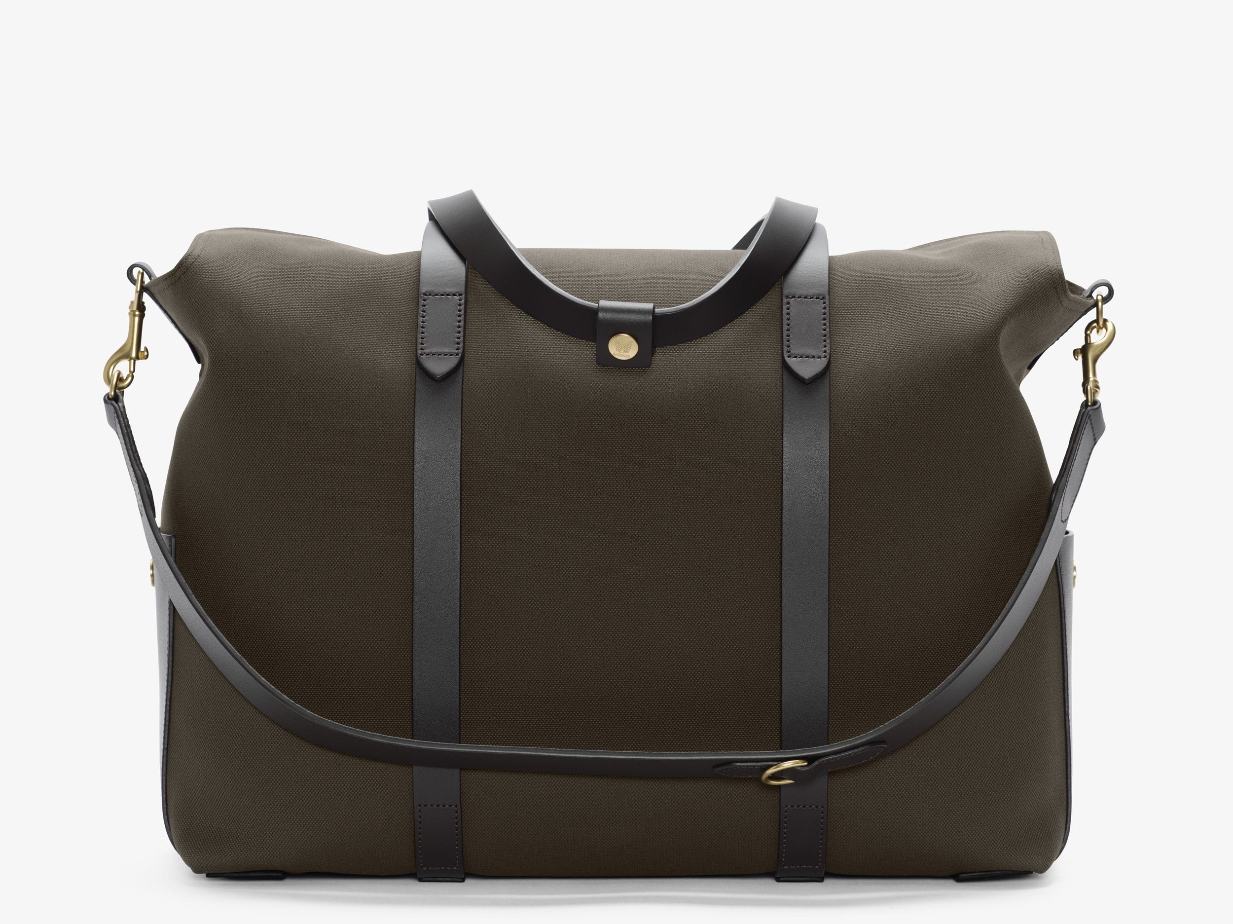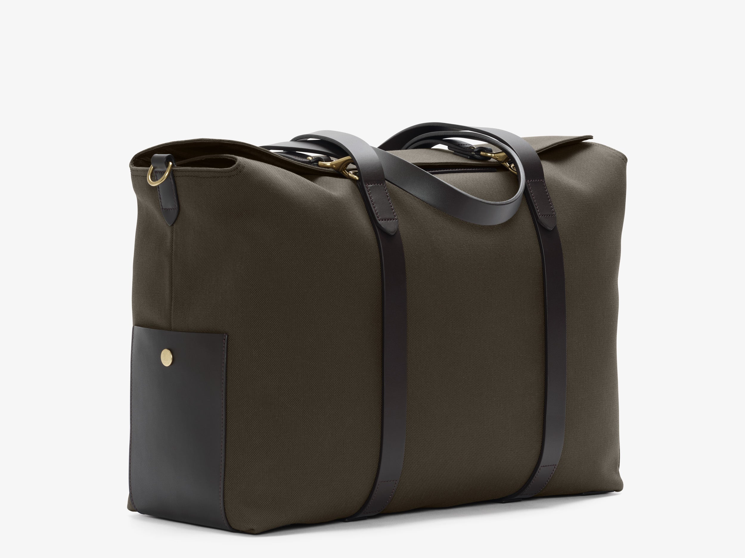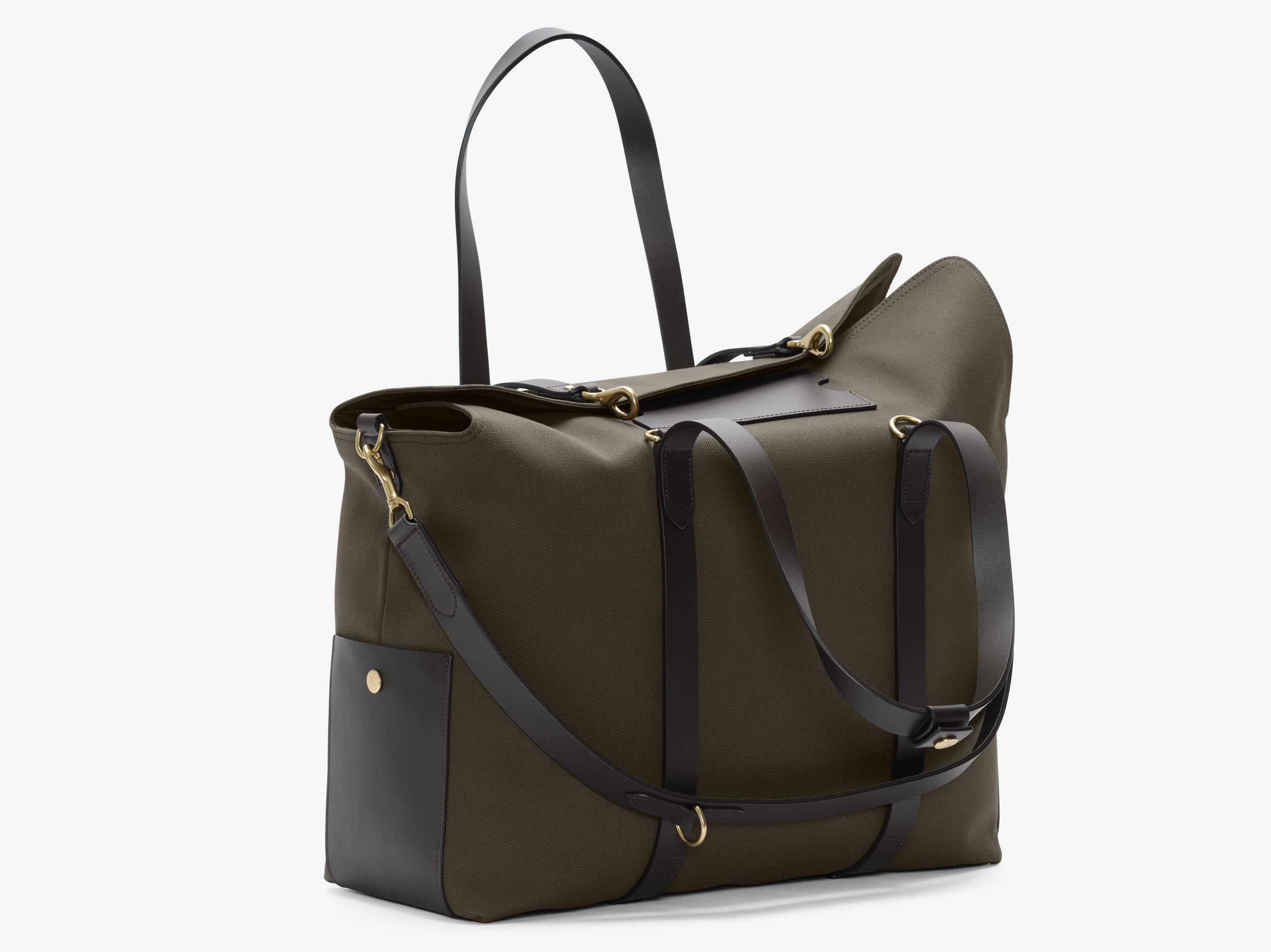 Use with the flaps closed as a travel bag, or bend flaps down for a large, open city tote bag. A full-grain leather pocket on each gusset adds extra durability to the bottom corners. Features an easy accessible leather pocket on the one flap, a large inside pocket for magazines and opposite two smaller slide down pockets for all the extras. Two additional inside pockets on each gusset ensure enough room for all your needs. A leather strap attached by hooks to the top gusset provides stable bag closure when the flaps are folded, and can also be used as shoulder strap.