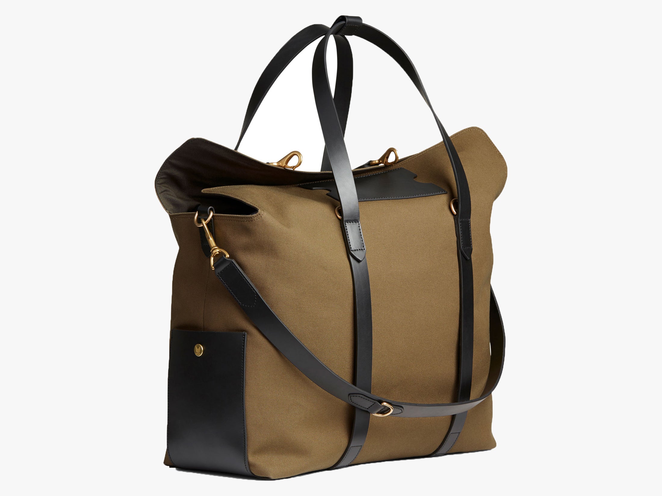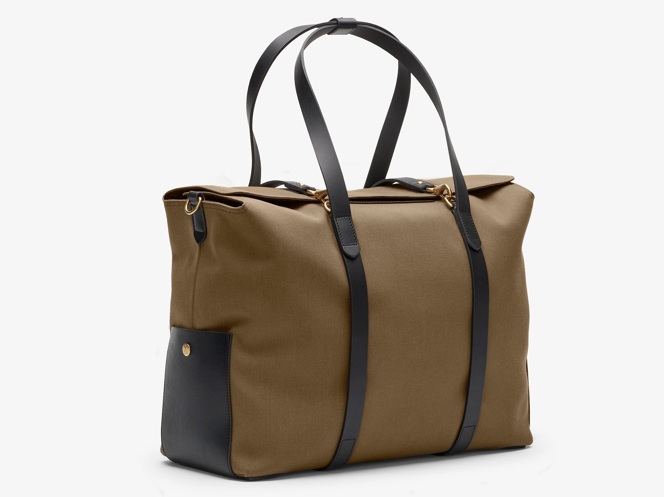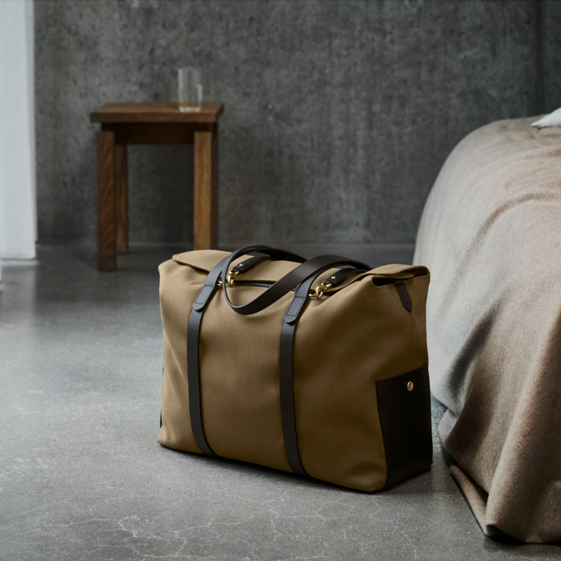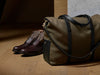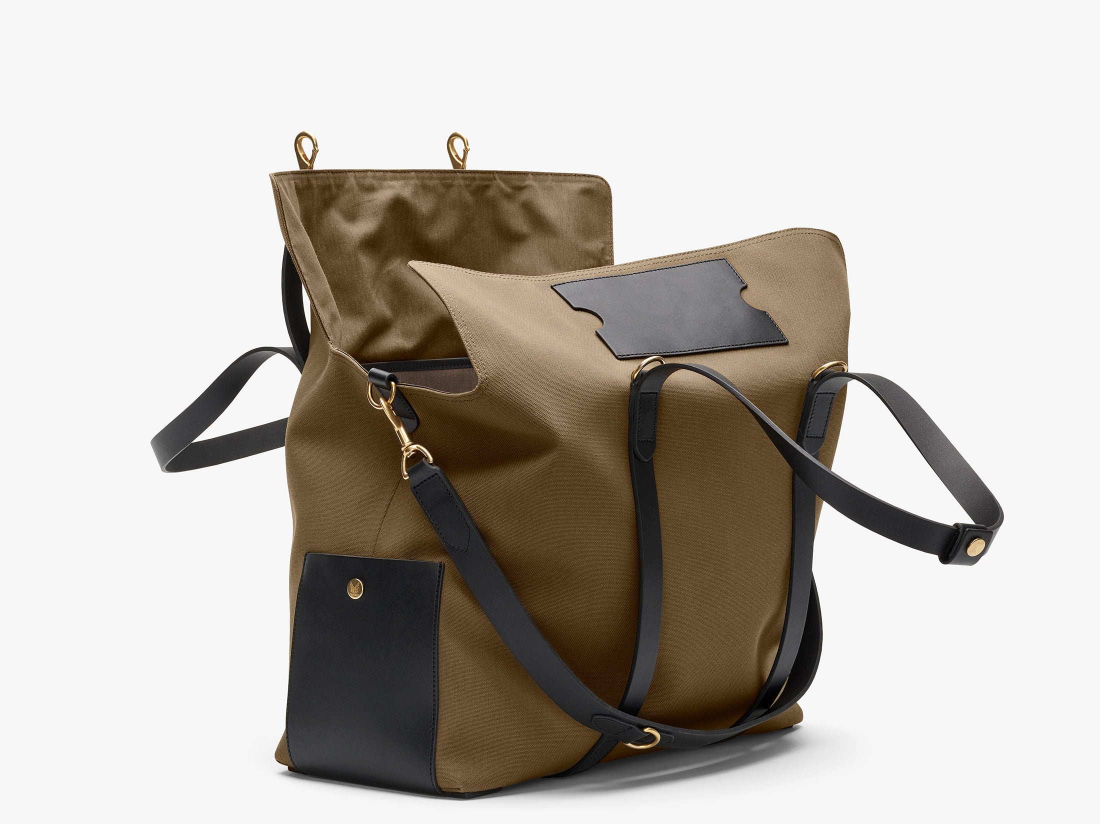 Set on a cotton warp and nylon weft, our khaki canvas offers the better of two worlds: the tactility of the cotton and the durability of the nylon. Add to that a soft backing, which gives the fabric the perfect weight to ensure a strong and natural draping. The earthy tones of the khaki canvas with a hint of green and brown paired with raven black bridle leather create a refined and timeless contrast. The canvas has been given a water-repellent treatment that makes it reject immediate stains and droplets.