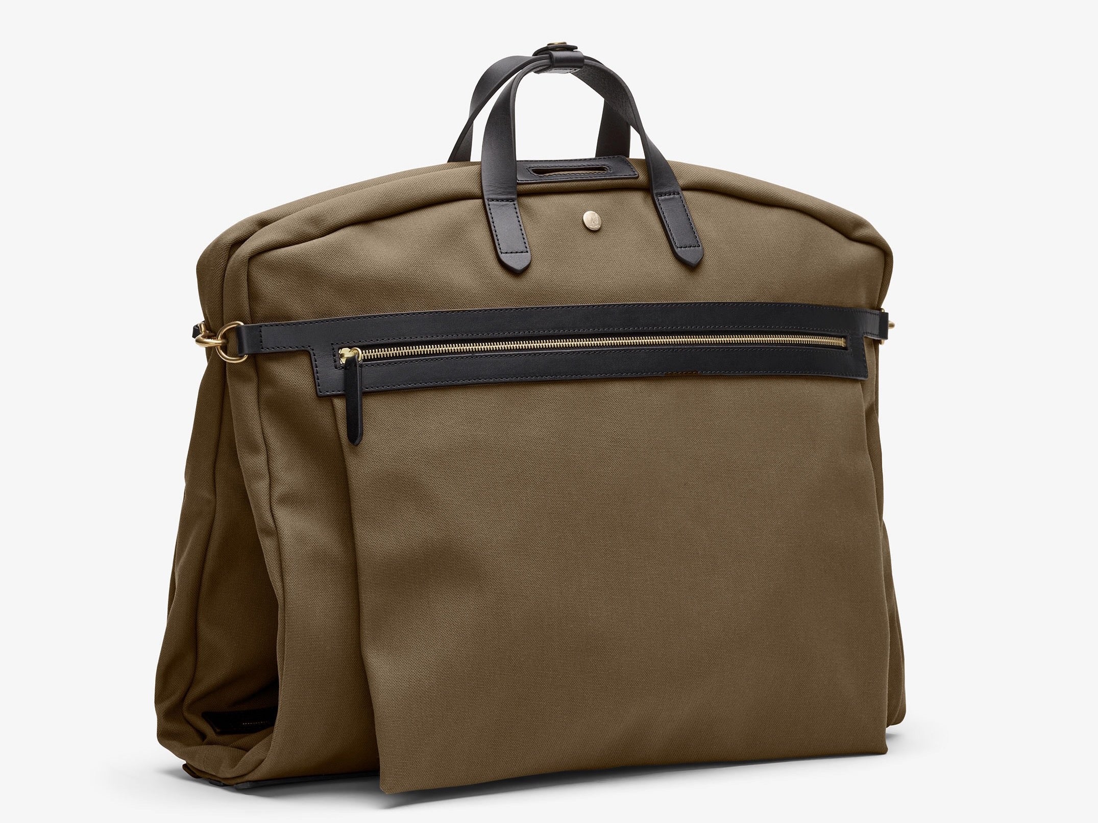 The M/S Suit Carrier zips fully open for easy access and is designed with two internal zipped pockets and a small slot for business cards. On the exterior, it features a large shoe pocket. Brass sailor-hook closures fastened to each gusset and a buttoned handle cover ensure that the bag remains shipshape when fully packed and folded.