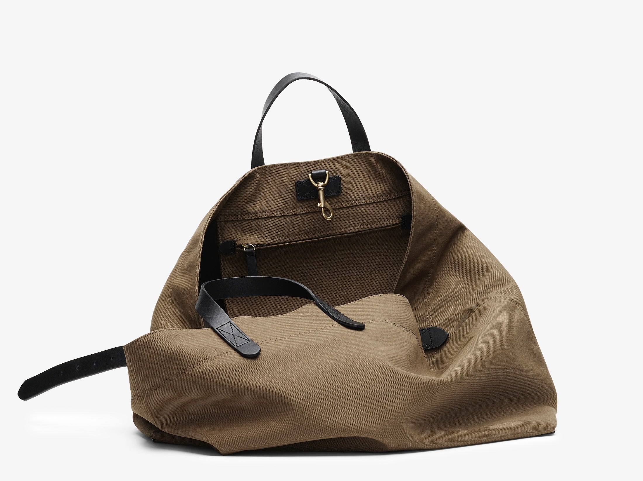 Two inside hanging pockets in the main canvas material, one with a snap button and the other with a zipped pocket allow easy organisation, while handles and an adjustable belt strap running from gusset to gusset offer flexible carrying options depending on mood, style and baggage load.