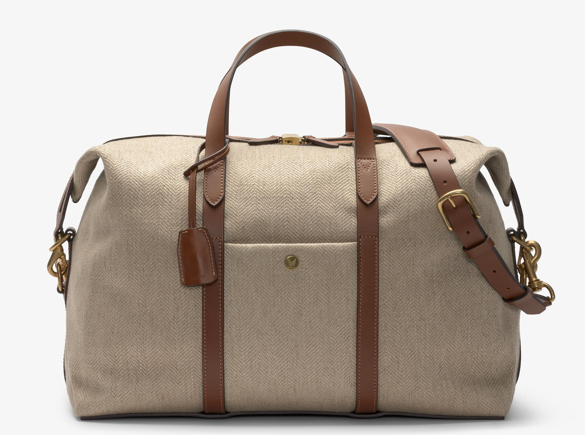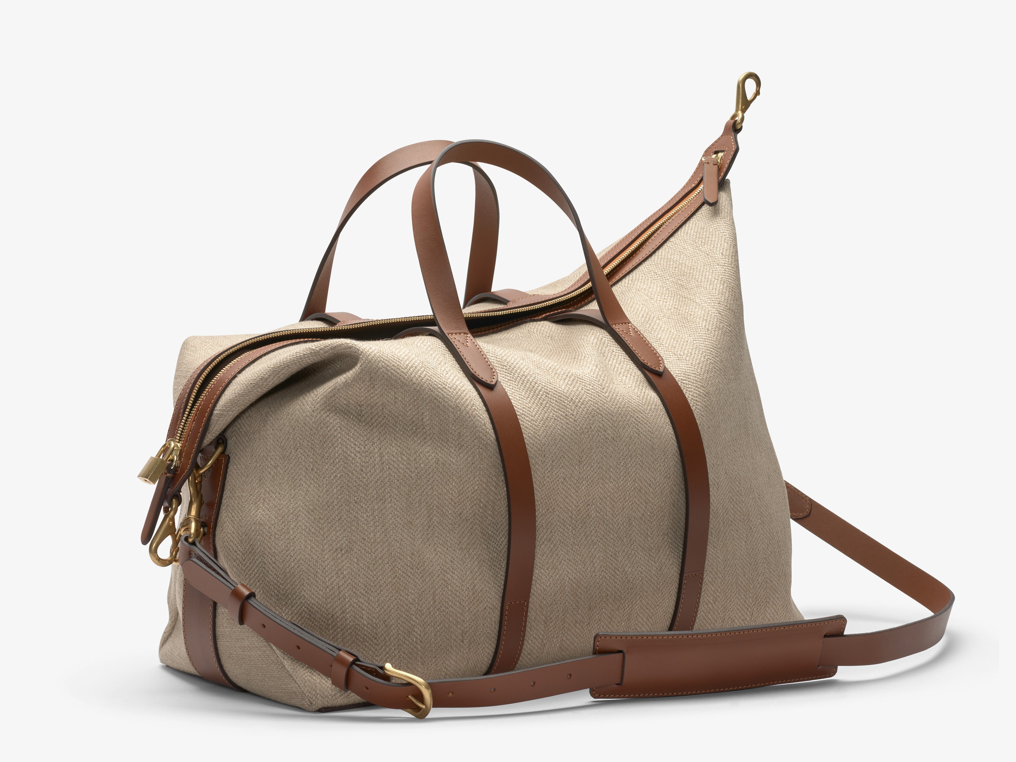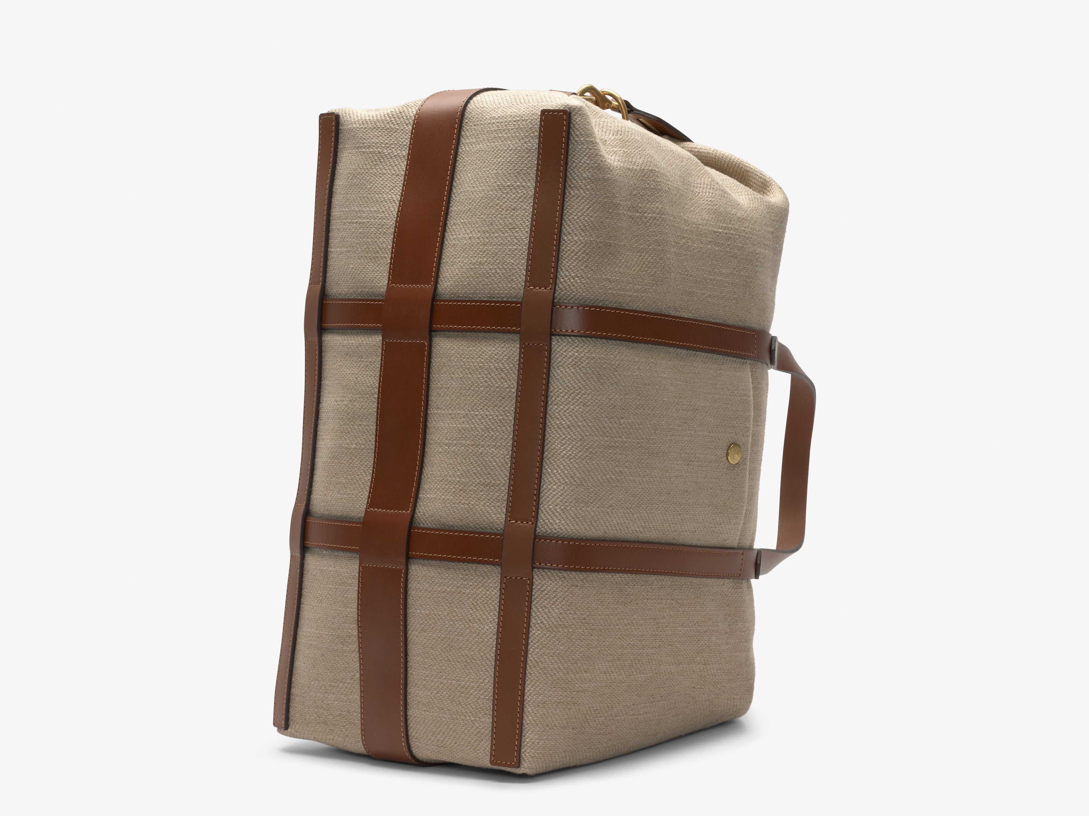 Linen herringbone Jacquard Full-grain bridle leather trim Solid brass accessories