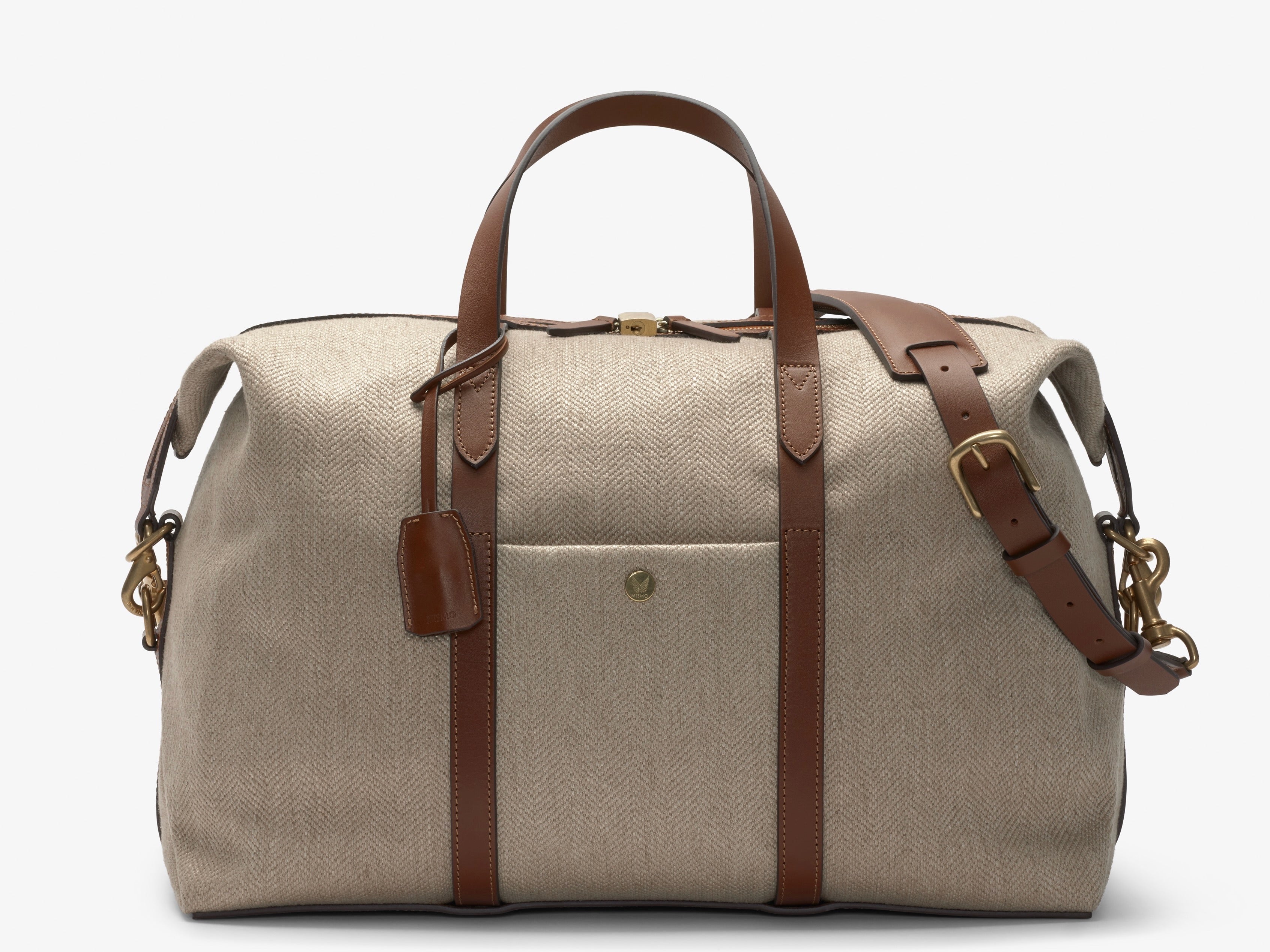 Linen herringbone Jacquard Full-grain bridle leather trim Solid brass accessories