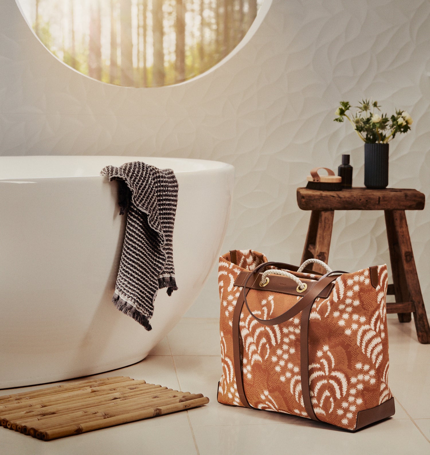 A fabric development with inspiration gleaned from the vintage weavings of the Limonta archives, this terracotta palm jacquard has summer warmth and adventure written all over it. It evokes instant dreams of summer relaxation, whether the restful palm shadow is cast in vibrant Marrakech or at colonial shores of Islamorada. We’ve paired the fabric with cuoio vegetable-tanned, full-grain bridle leather for a rich vintage look and trimmed it with the solid brass accessories. The base weaving of the jacquard is kept in two shades of warm terracotta with palms and star motifs in off-white cotton, all complementing the earthy tabac tones of the leather. Even used with no palm trees around this jacquard will still make you feel serene.