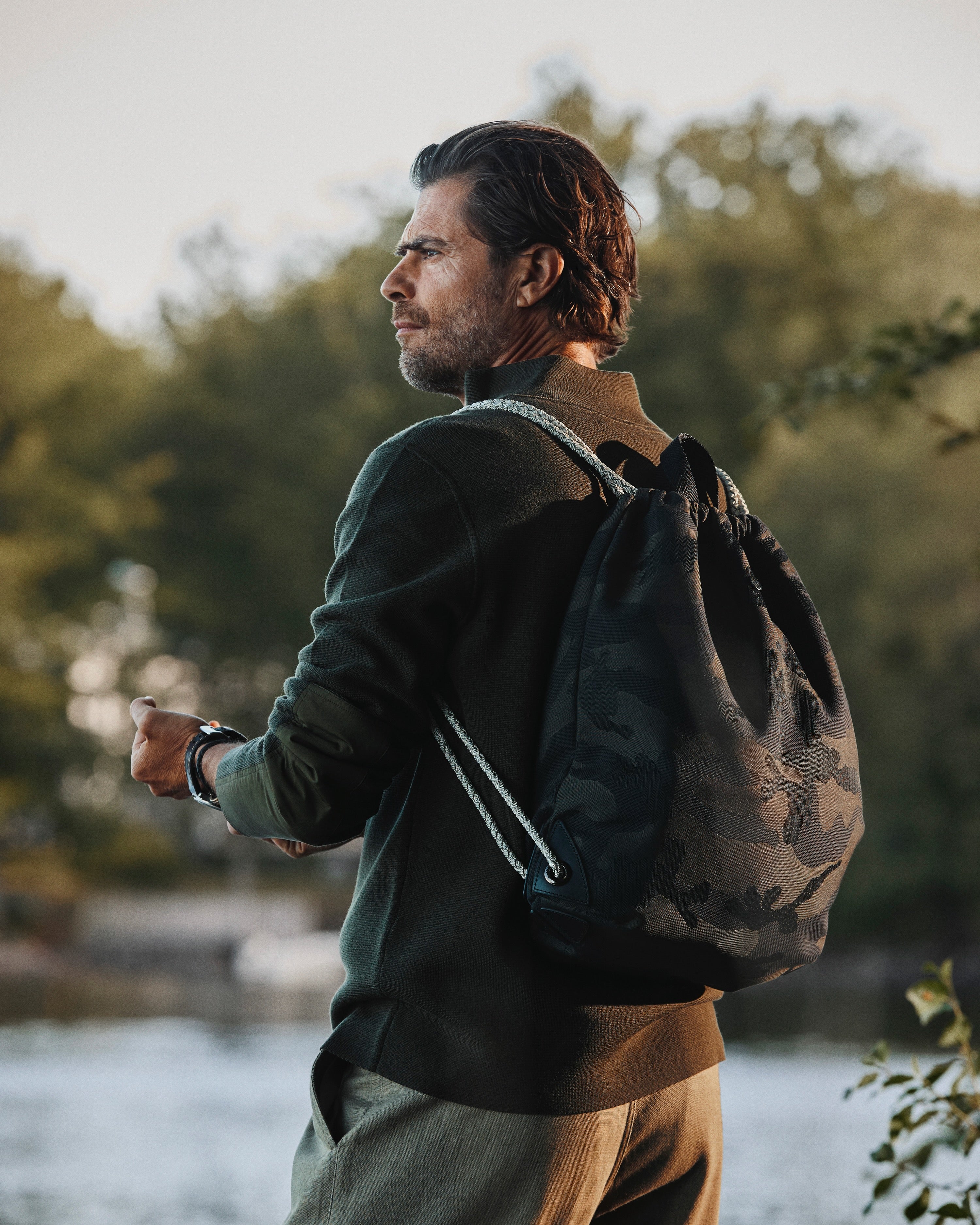 The M/S Drawstring is one of those cherished styles we simply love designing. Thousands of its predecessors pay testimony to its basic usability, so a style like this is all about refinement. Strong camo jacquard for expression and functionality, nylon sailor rope, handle ribbons in sturdy nylon, and everlasting gun-metal eyelets – everything sourced from Italy’s best suppliers in their fields.