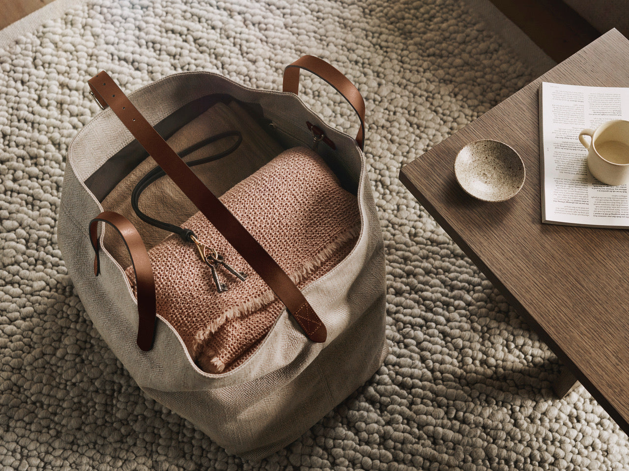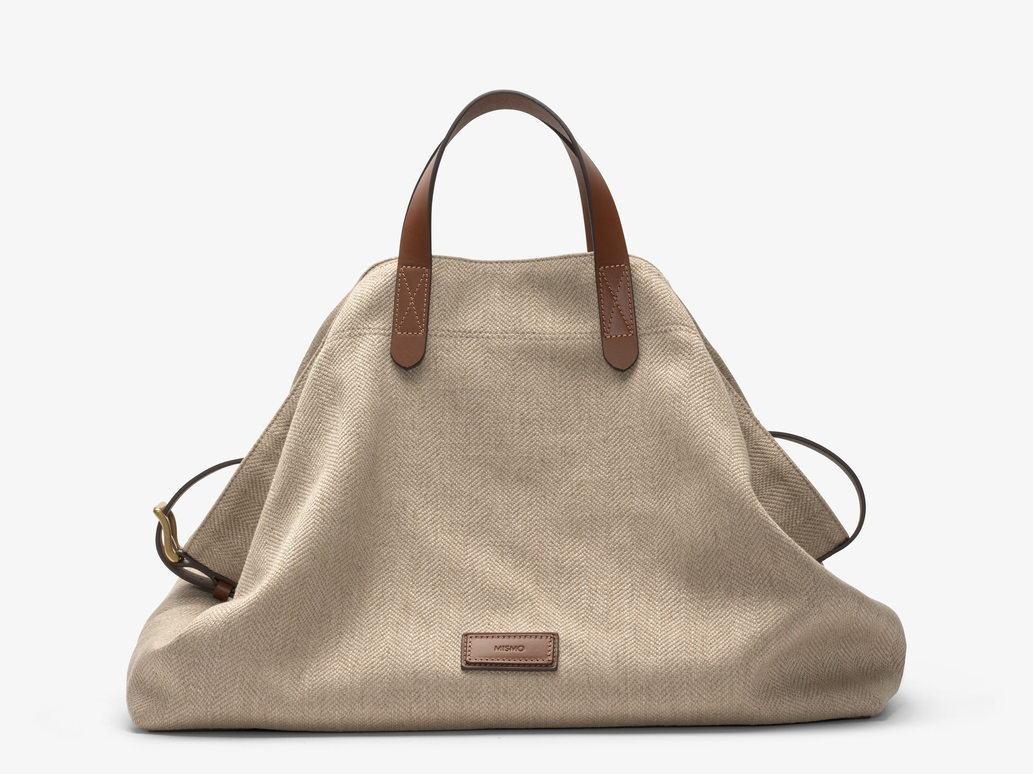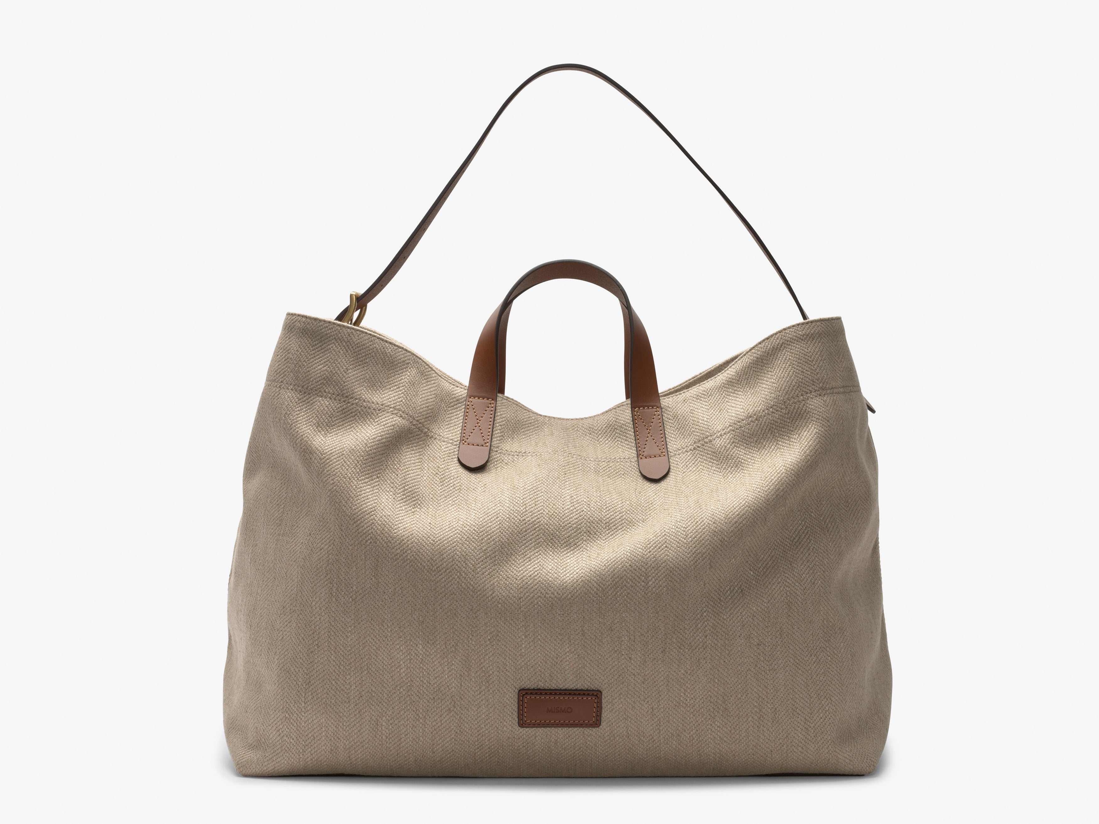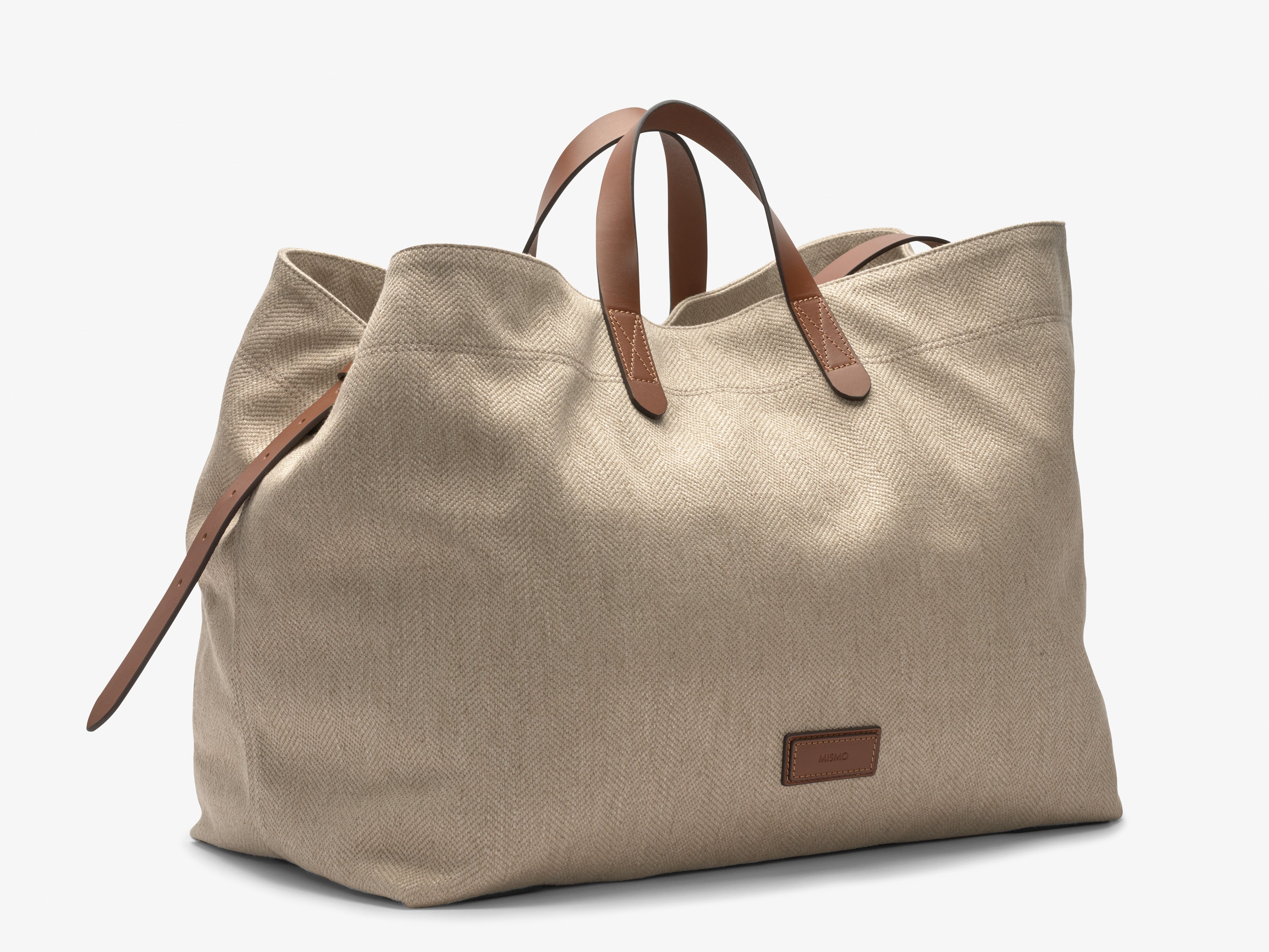 Linen herringbone Jacquard Full-grain bridle leather trim Solid brass accessories