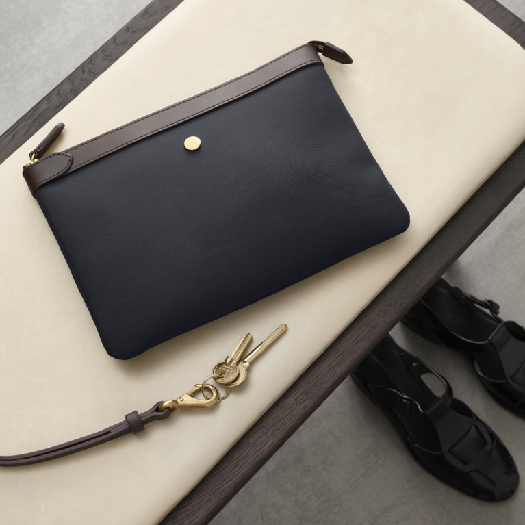 Waterproof, tight-woven recycled nylon / 40.000 Martindale Full-grain bridle leather trim Solid brass accessories