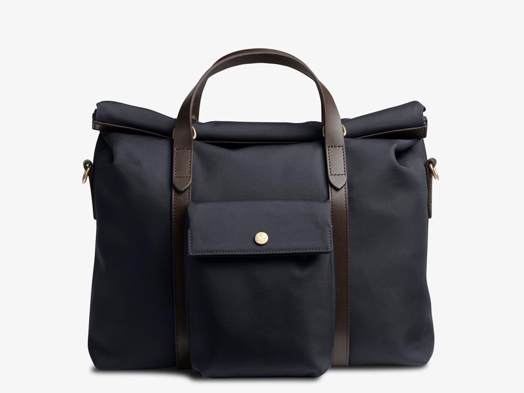 Inspired by old-fashioned grocery bags, M/S Soft Work is the result of an ambition to create a stylish, yet casual and highly functional bag for days at the office. The bag's signature is its folded top closure, which makes it just as easy to open the bag as it is to close it. Just button the top part together, then fold down and secure with the two sailor snap hooks attached behind the handles.