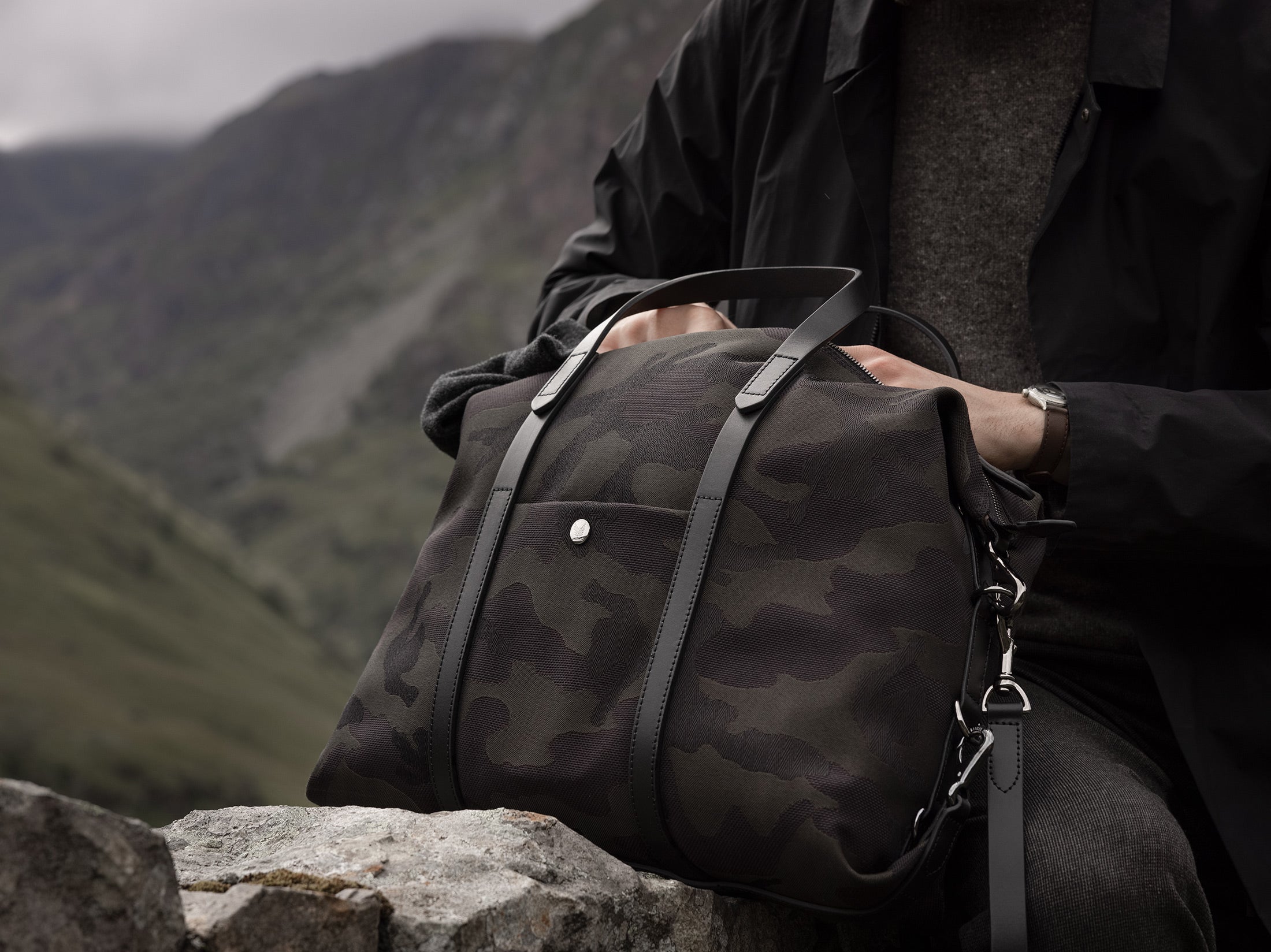 A flexible duffle/work bag that can be adjusted in size by attaching the snap hooks in each corner of the bag to the brass D-rings on the gusset. Features an external pocket, YKK Excella double zipper, internal zip pocket and opposite two deep open pockets. Includes an adjustable and detachable shoulder strap.