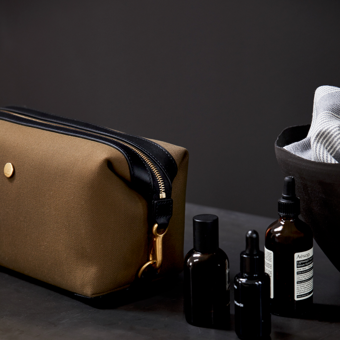 Set on a cotton warp and nylon weft, our khaki canvas offers the better of two worlds: the tactility of the cotton and the durability of the nylon. Add to that a soft backing, which gives the fabric the perfect weight to ensure a strong and natural draping. The earthy tones of the khaki canvas with a hint of green and brown paired with raven black bridle leather create a refined and timeless contrast. The canvas has been given a water-repellent treatment that makes it reject immediate stains and droplets.