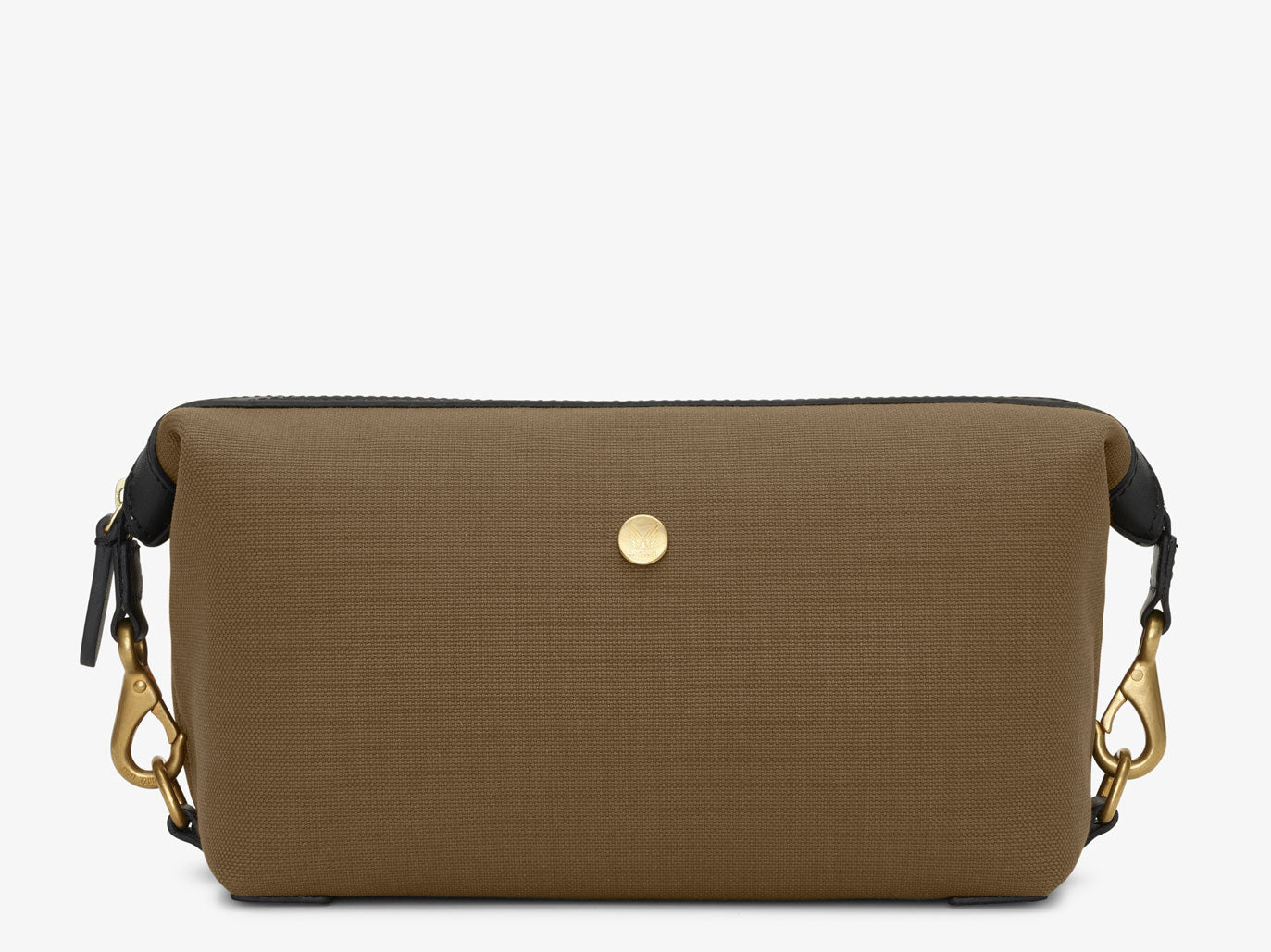 Designed with a single unified compartment containing a central zipped pocket and two additional slit pockets on either side. The interior is lined with water-repellent PVC. The wash bag has a zip-top opening with snap-hook closures at each gusset, which can double as handles.