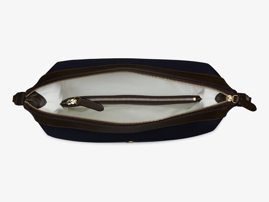 Designed with a single unified compartment containing a central zipped pocket and two additional slit pockets on either side. The interior is lined with water-repellent PVC. The wash bag has a zip-top opening with snap-hook closures at each gusset, which can double as handles.