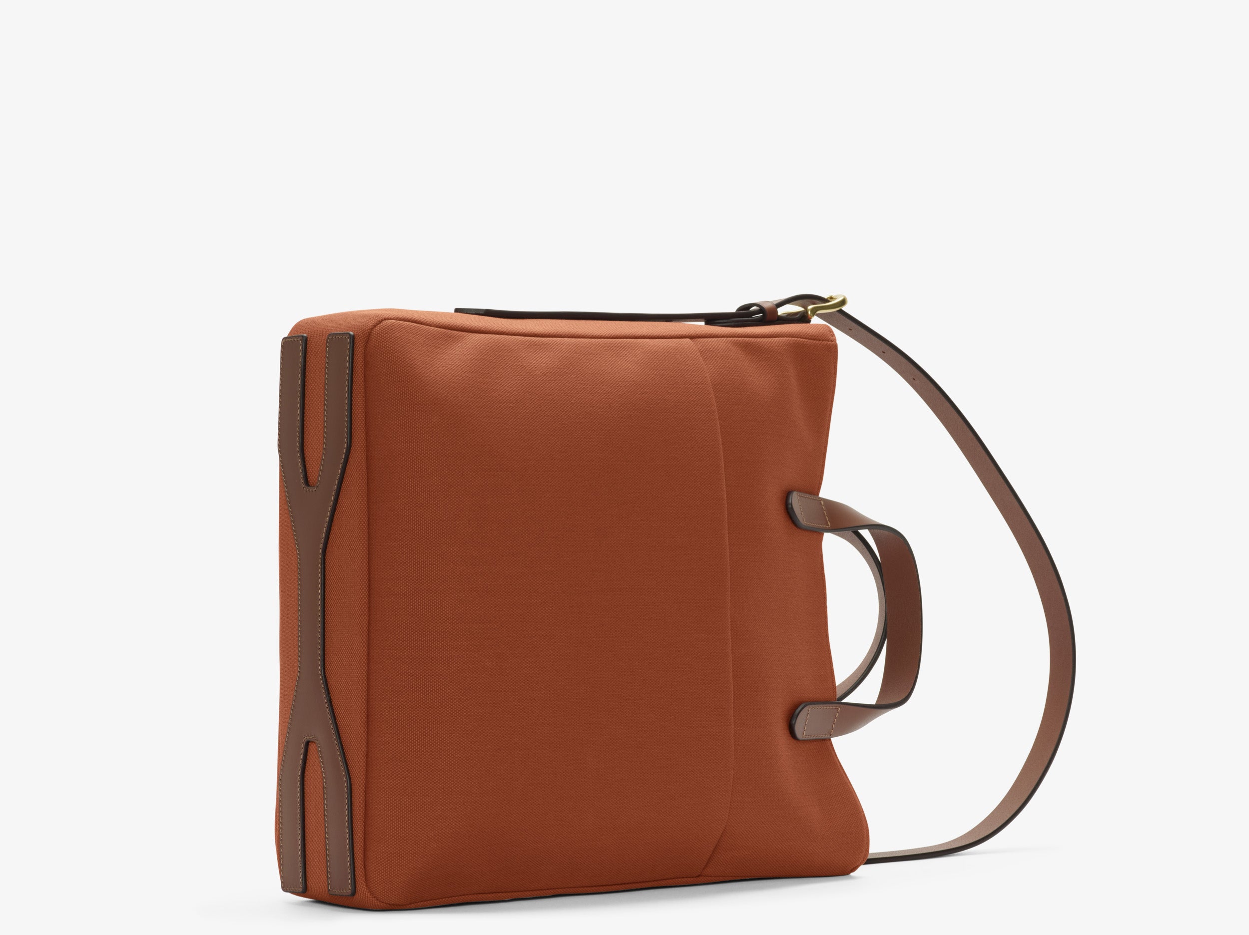The rich, earthen hue of the Terracotta canvas carries the essence of sunbaked landscapes and aged ceramics, while the golden-brown Cuoio leather brings a refined contrast. Set on a cotton warp and nylon weft, our canvas offers the better of two worlds: the tactility of the cotton and the durability of the nylon. Add to that a soft backing, which gives the fabric the perfect weight to ensure a strong and natural draping. The canvas has been given a water-repellent treatment that makes it reject immediate stains and droplets.