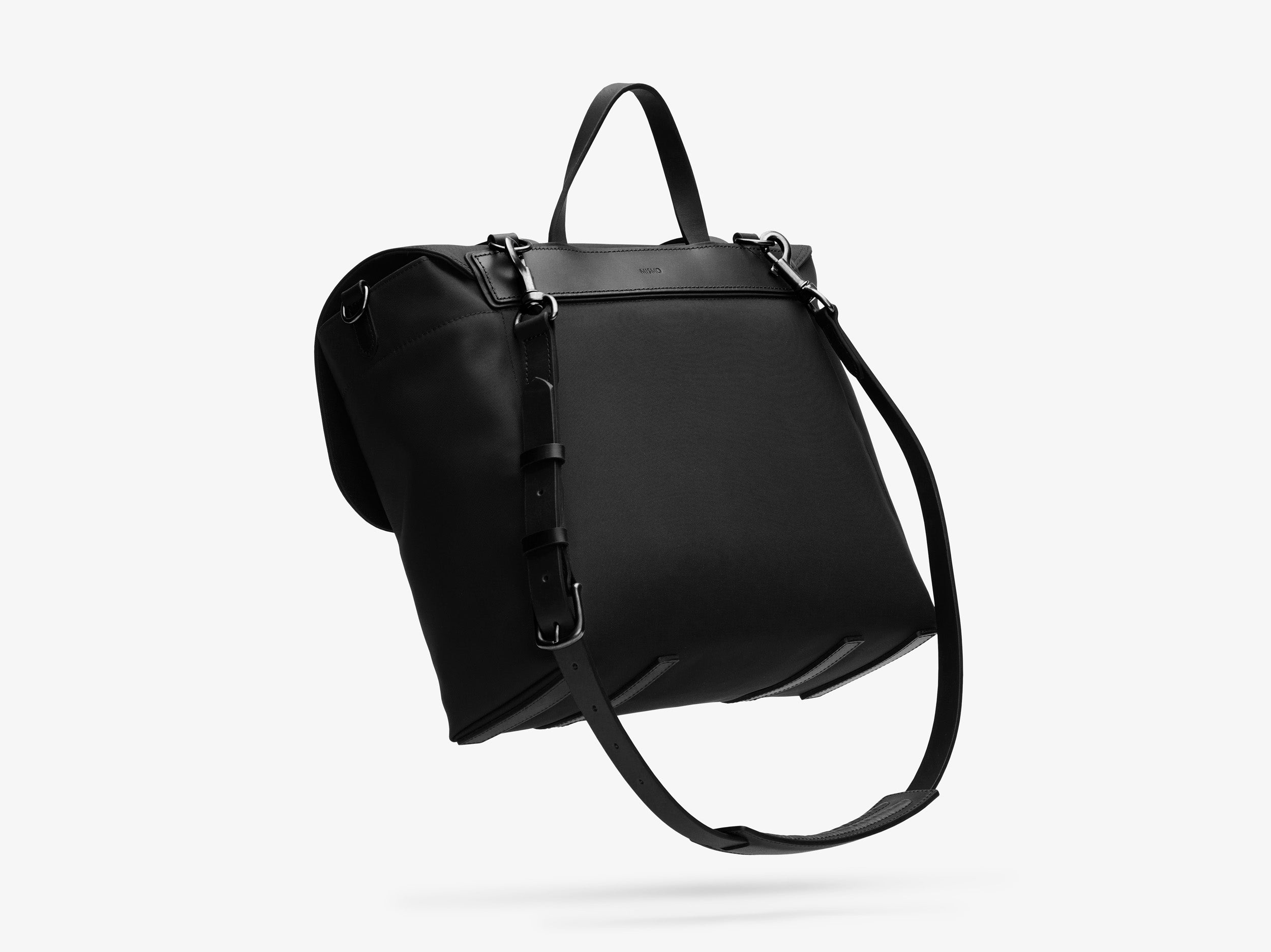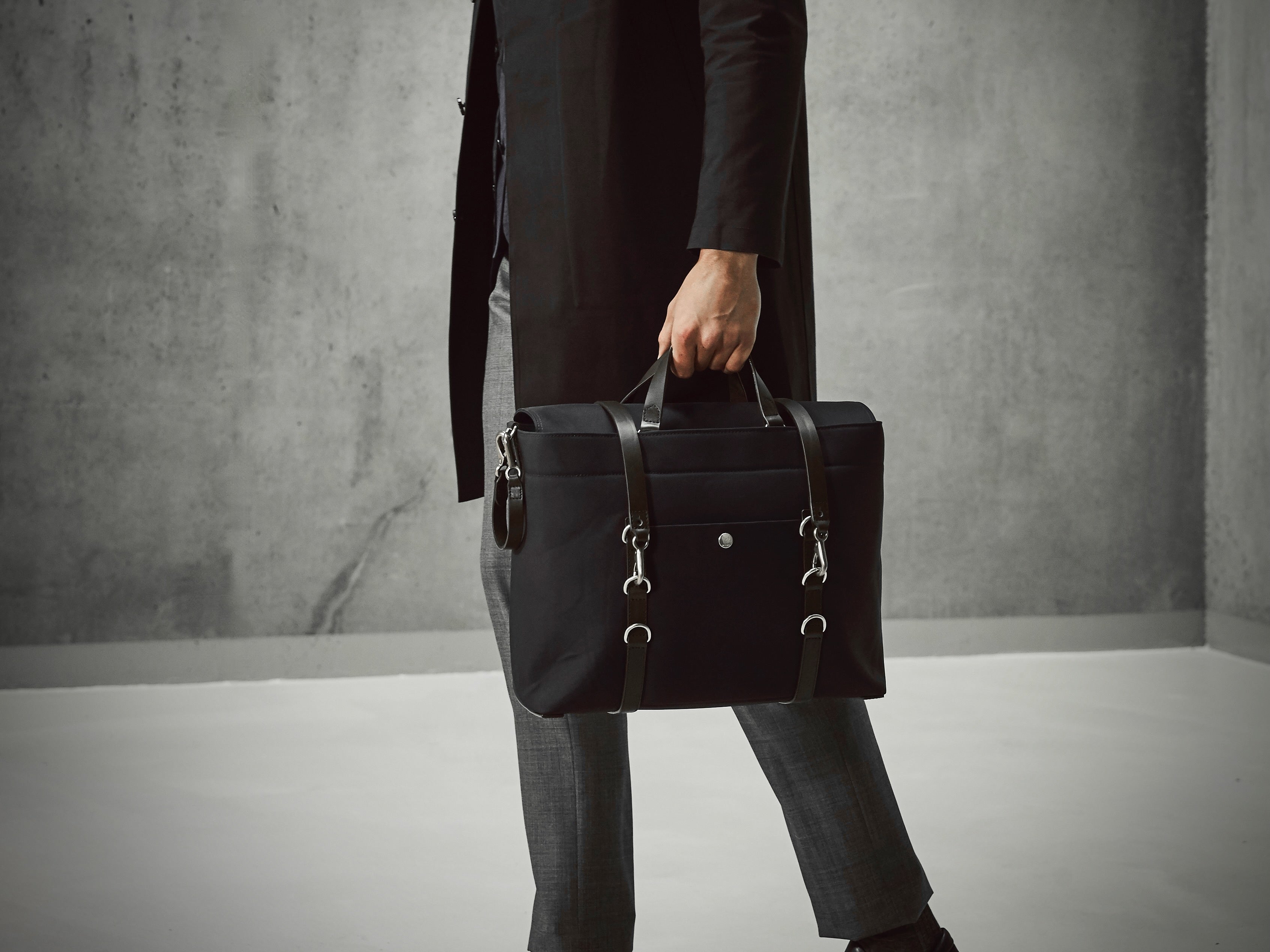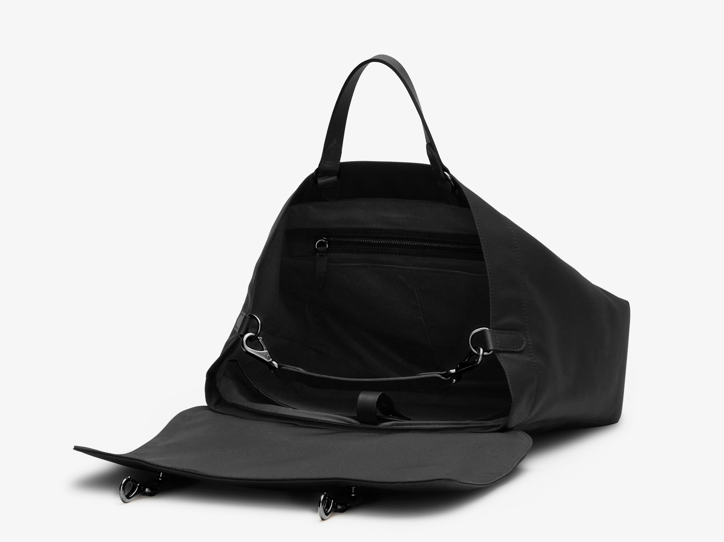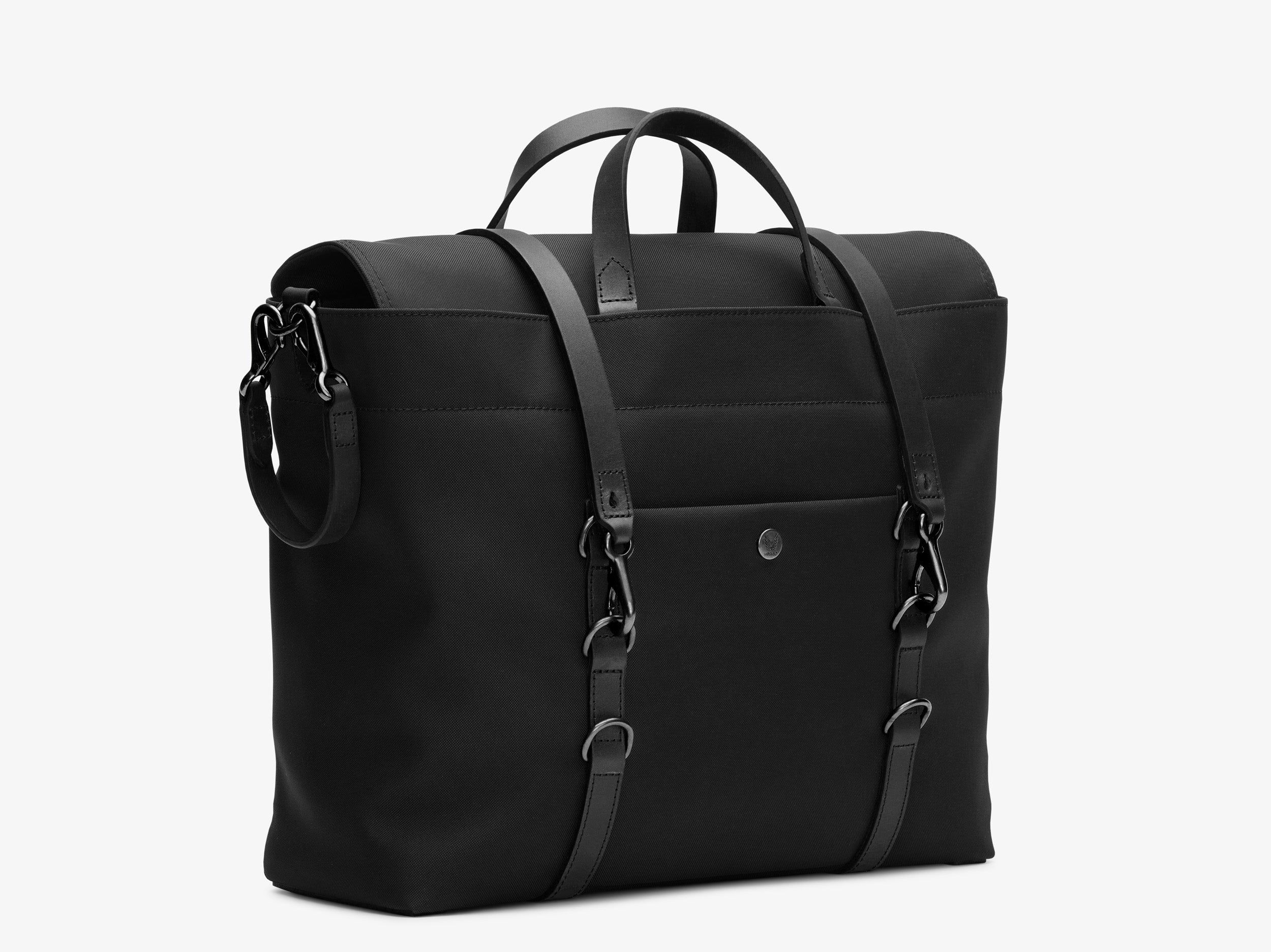 A truly versatile on-the-go bag. Use it as a regular messenger bag with the front flap down for versatile closure using the three pairs of D-rings on the front. Or use it with the flap folded inside the bag to turn it into a more regular two-handle briefcase by grabbing the extra handle attached to two D-rings on the backside of the front face.