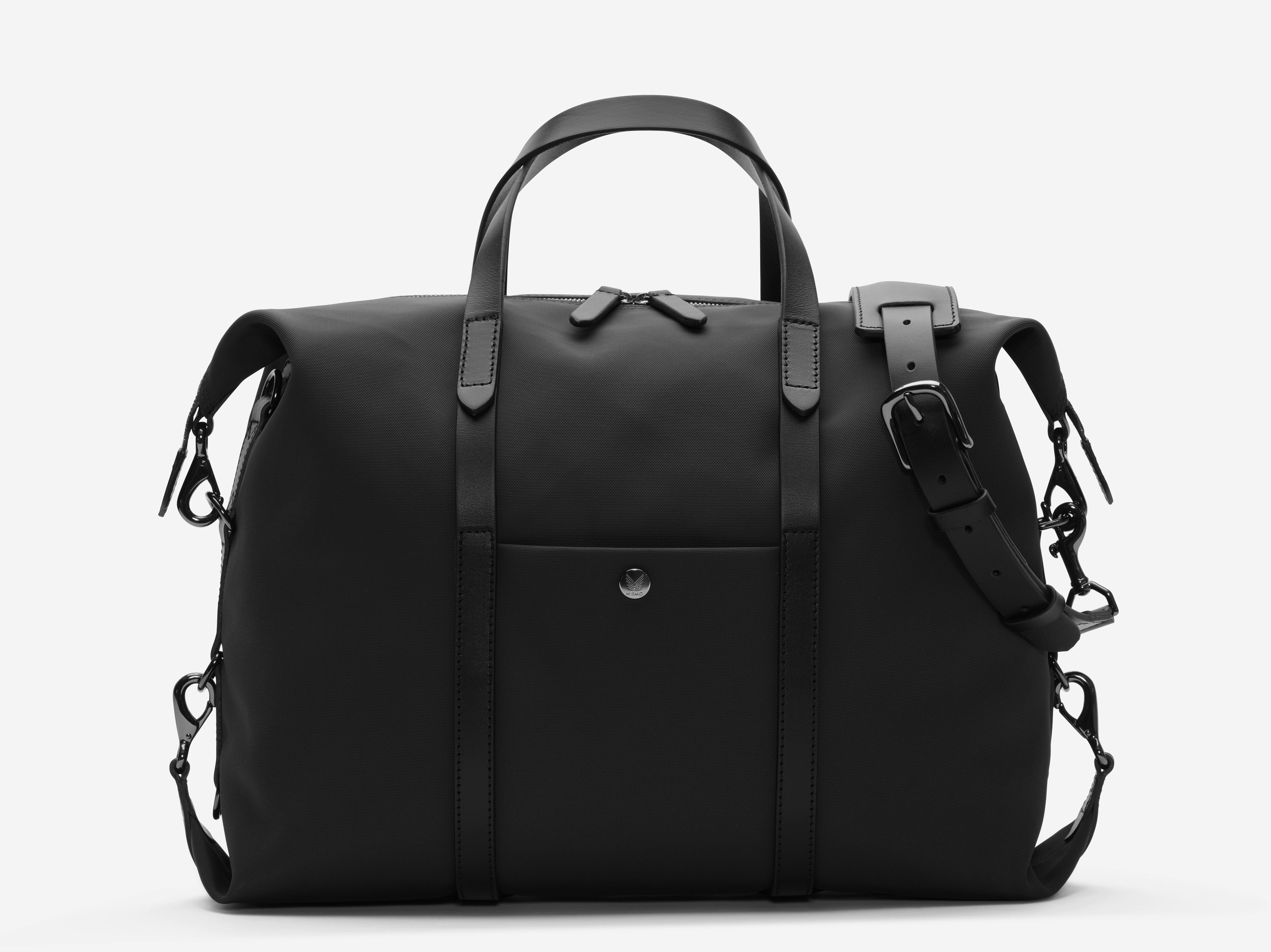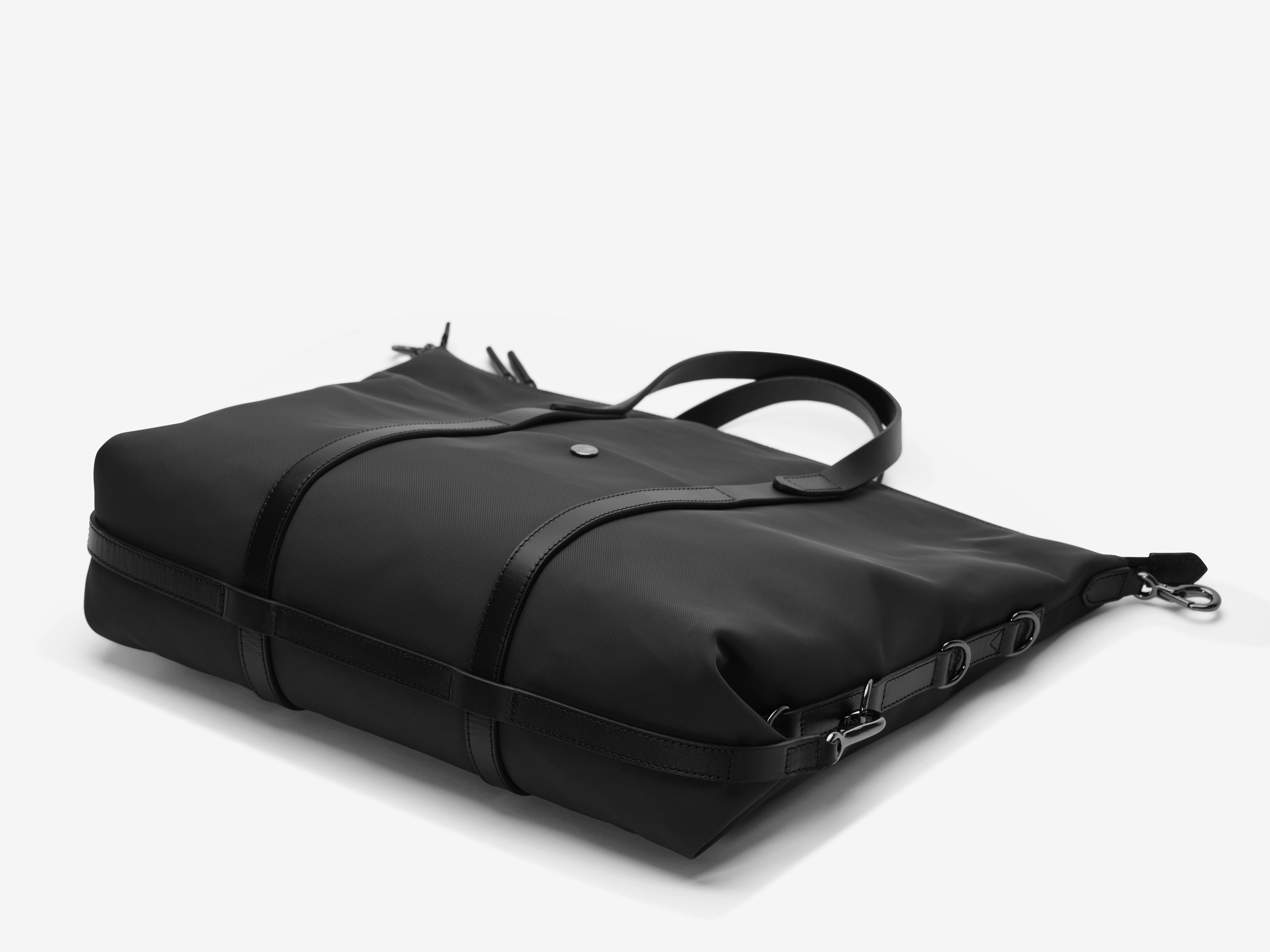 A flexible duffle/work bag that can be adjusted in size by attaching the snap hooks in each corner of the bag to the brass D-rings on the gusset. Features an external pocket, YKK Excella double zipper, internal zip pocket and opposite two deep open pockets. Includes an adjustable and detachable shoulder strap.
