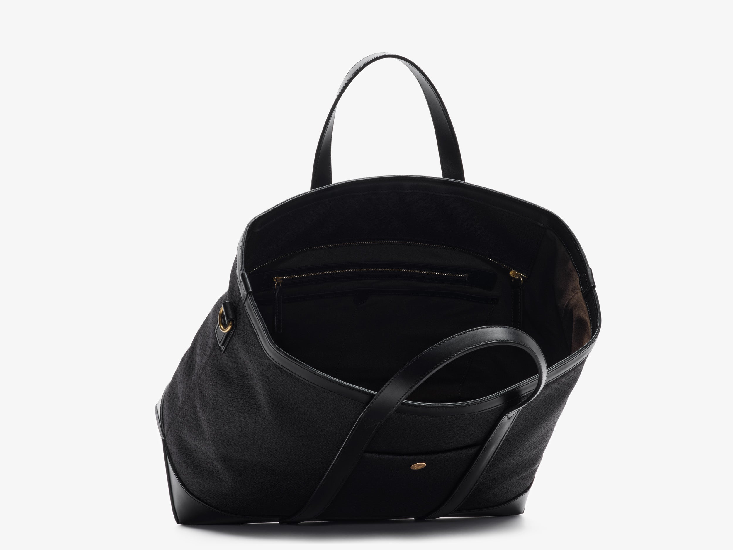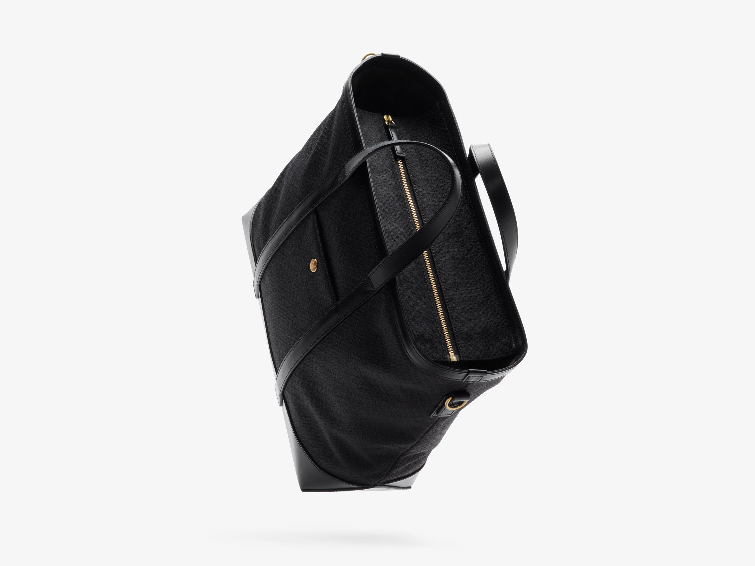 True to its name, this mid-sized tote bag is an energetic companion to your daily pursuits. Leather detailing throughout pairs with elegant fabric for a geometrical inspired and eye-catching appearance. A natural addition to a day at the office or more energetic pursuits in the city.