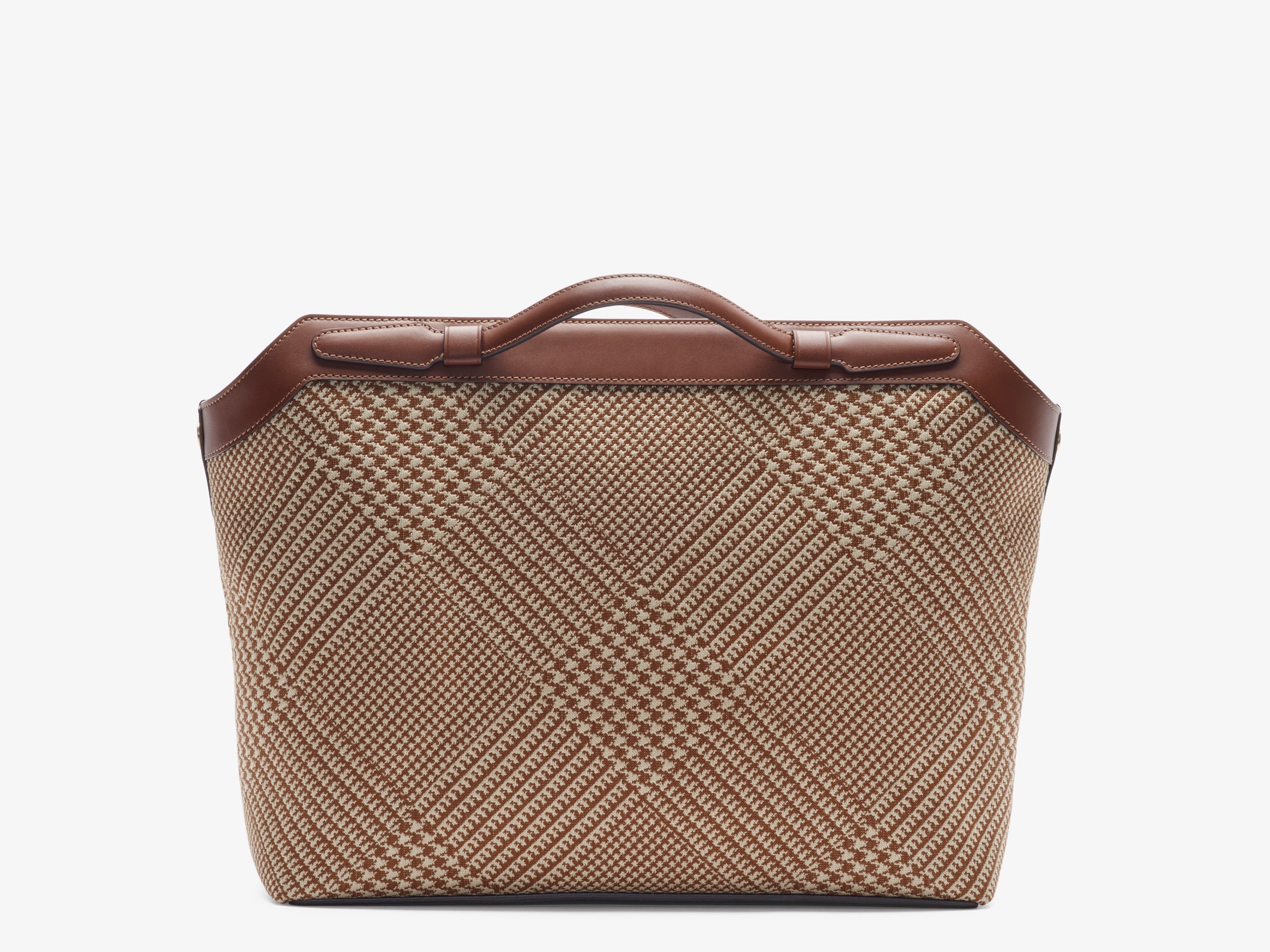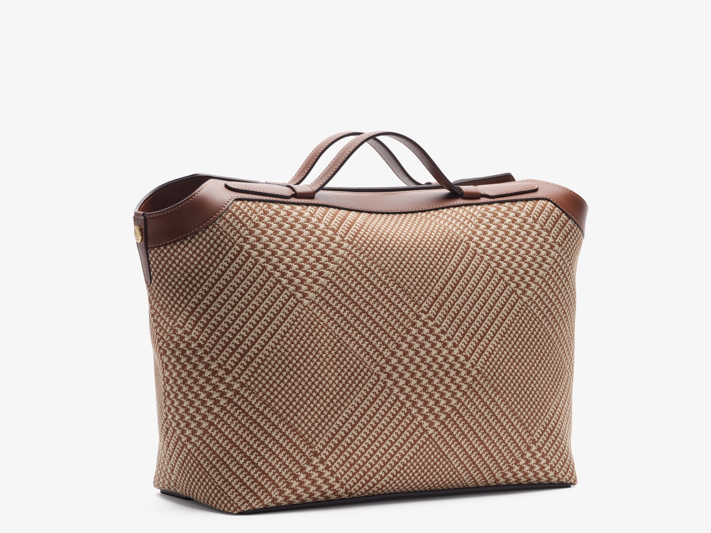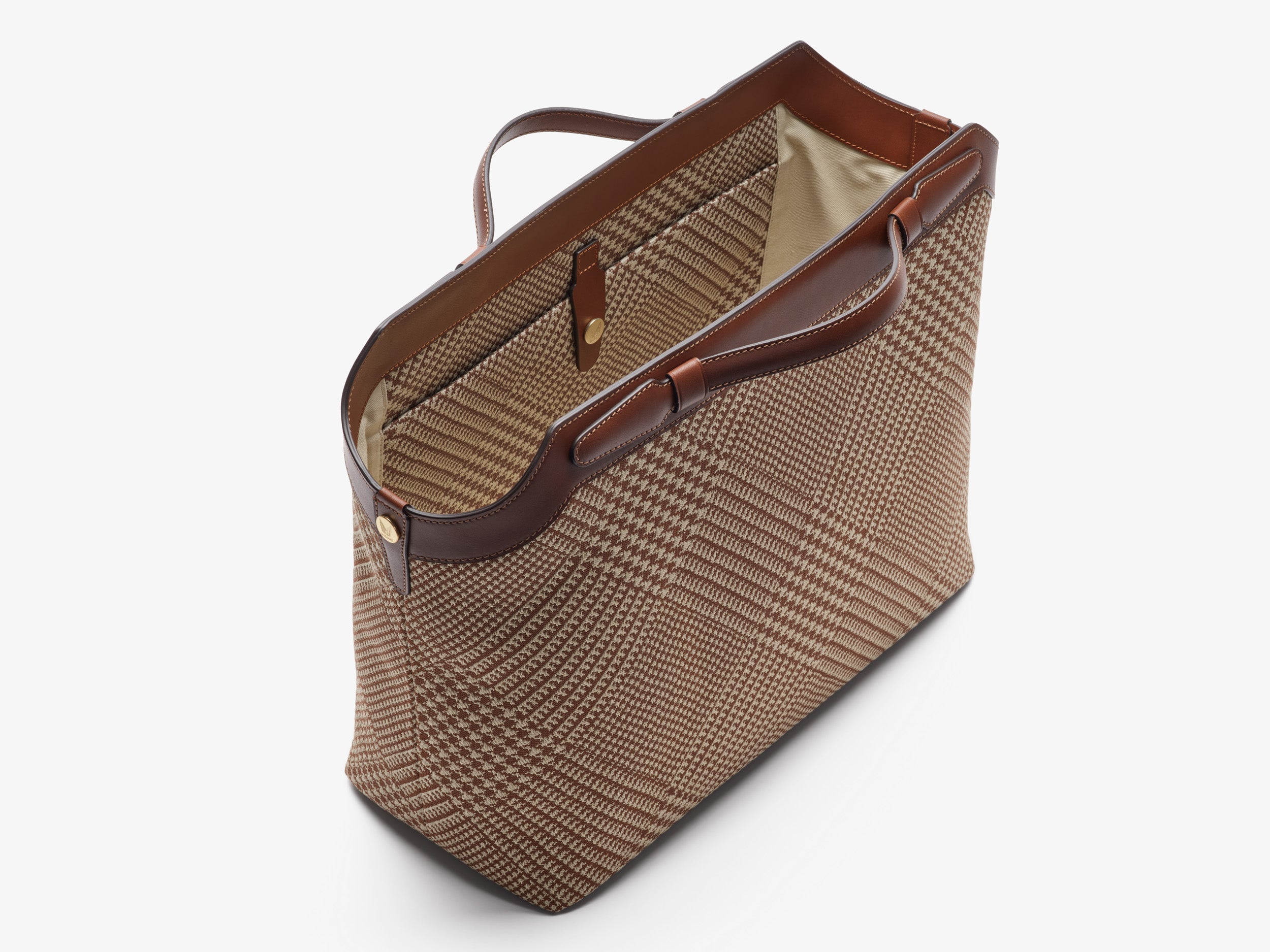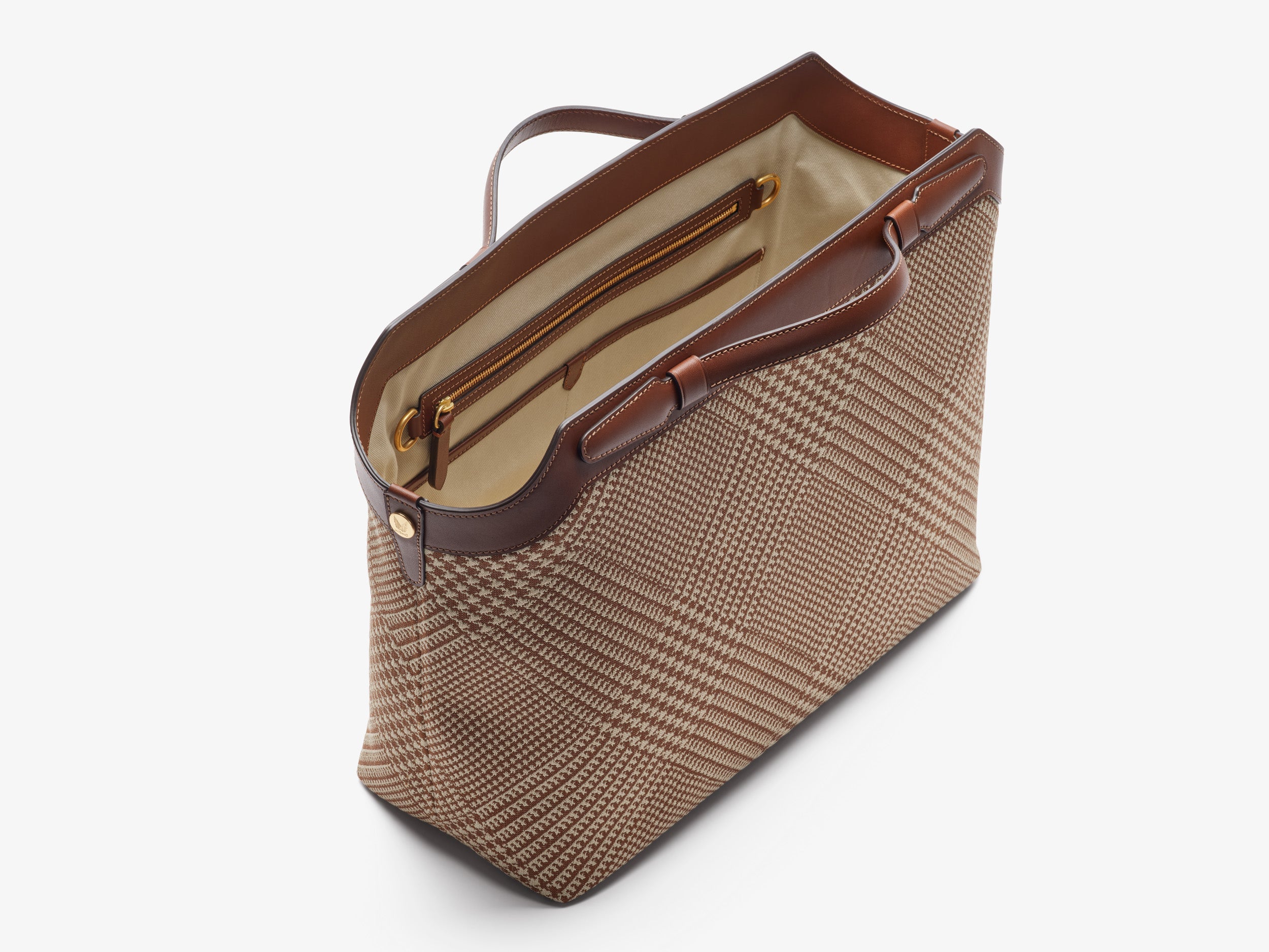 Inside, thoughtful craftsmanship meets seamless organization. A beige cotton-lined interior offers warmth and contrast, while a dedicated laptop pocket in matching outer fabric ensures practicality. On the opposite side, a zip pocket and two open compartments provide easy access to smaller essentials. Slightly foamed handles add a soft, voluminous touch, offering comfort in hand. Balanced in form and presence, the M/S Well carries itself with quiet distinction.