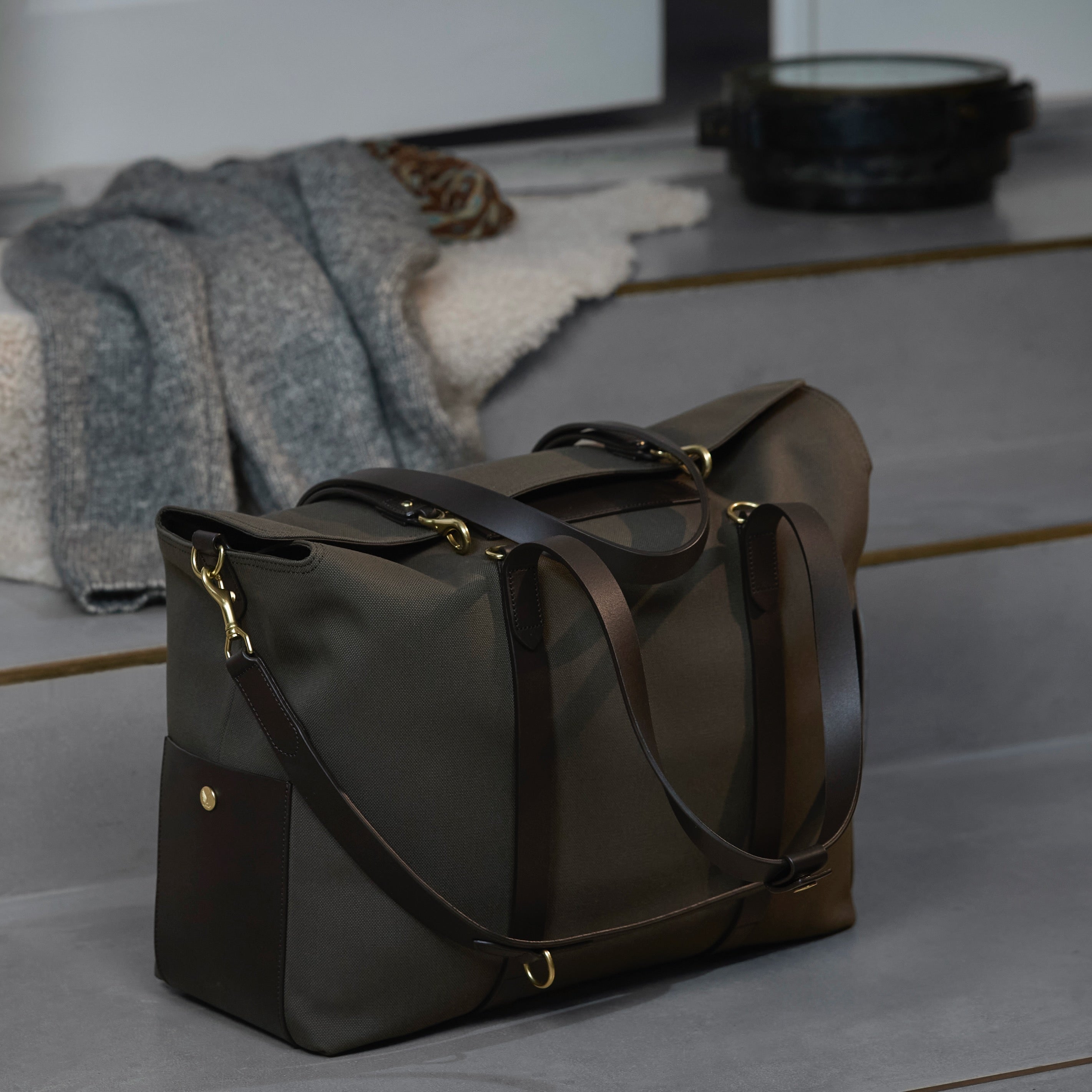 Use with the flaps closed as a travel bag, or bend flaps down for a large, open city tote bag. A full-grain leather pocket on each gusset adds extra durability to the bottom corners. Features an easy accessible leather pocket on the one flap, a large inside pocket for magazines and opposite two smaller slide down pockets for all the extras. Two additional inside pockets on each gusset ensure enough room for all your needs. A leather strap attached by hooks to the top gusset provides stable bag closure when the flaps are folded, and can also be used as shoulder strap.