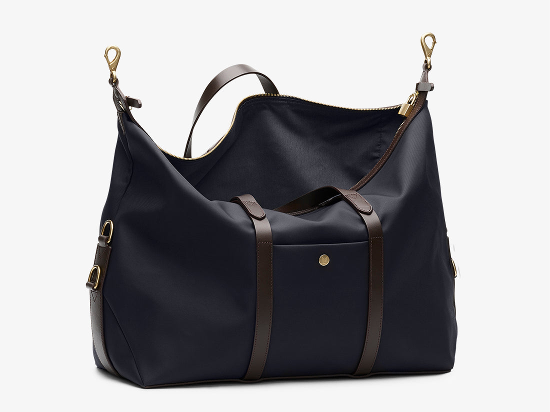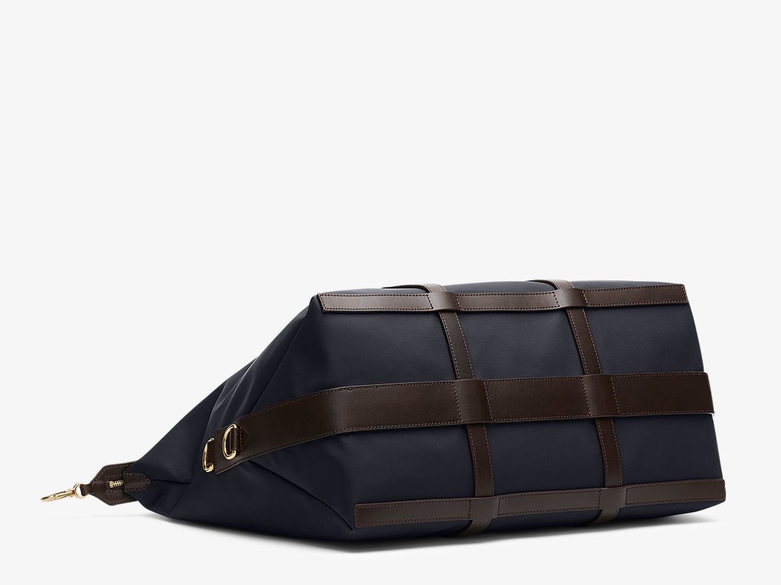 Waterproof, tight-woven recycled nylon / 40.000 Martindale Full-grain bridle leather trim Solid brass accessories