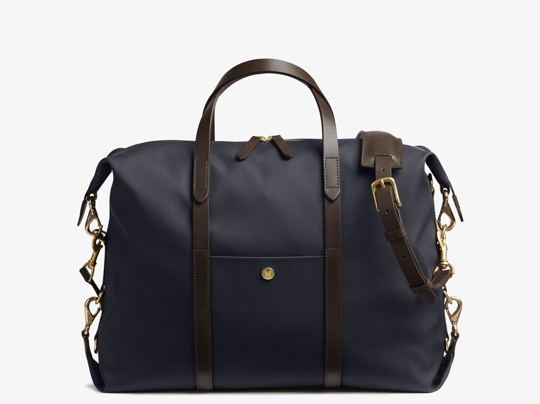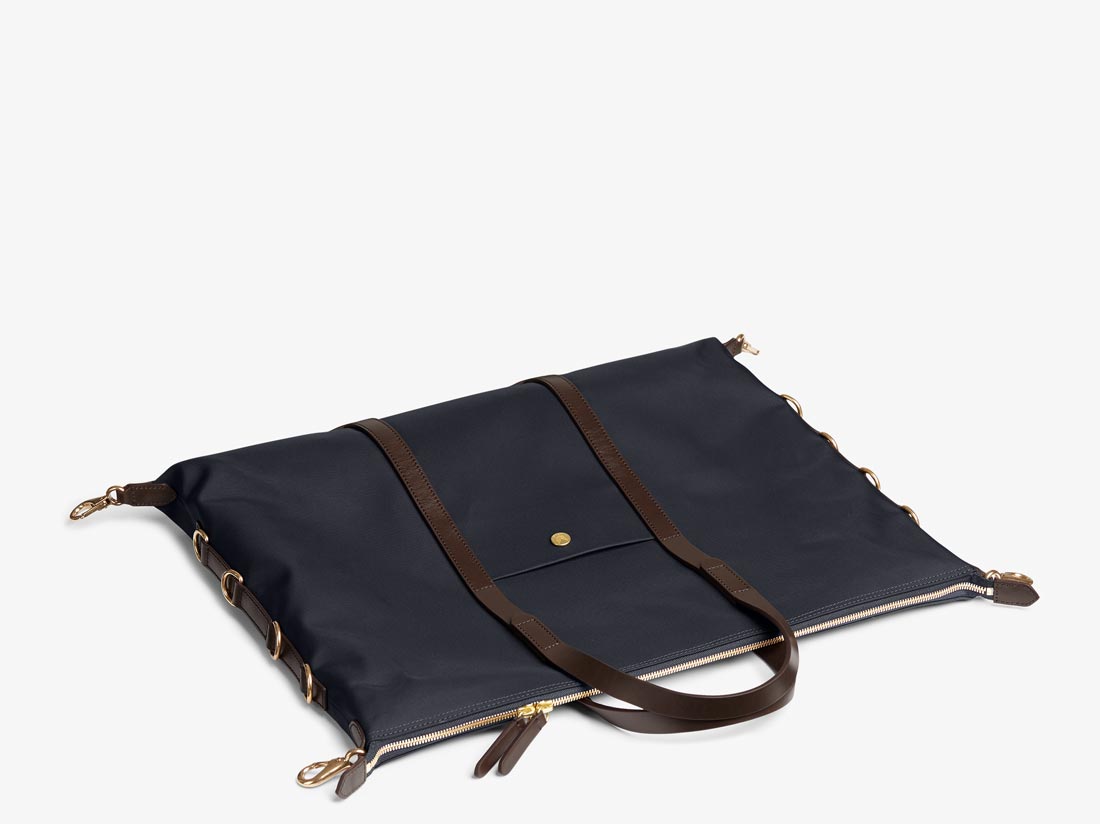 Waterproof, tight-woven recycled nylon / 40.000 Martindale Full-grain bridle leather trim Solid brass accessories