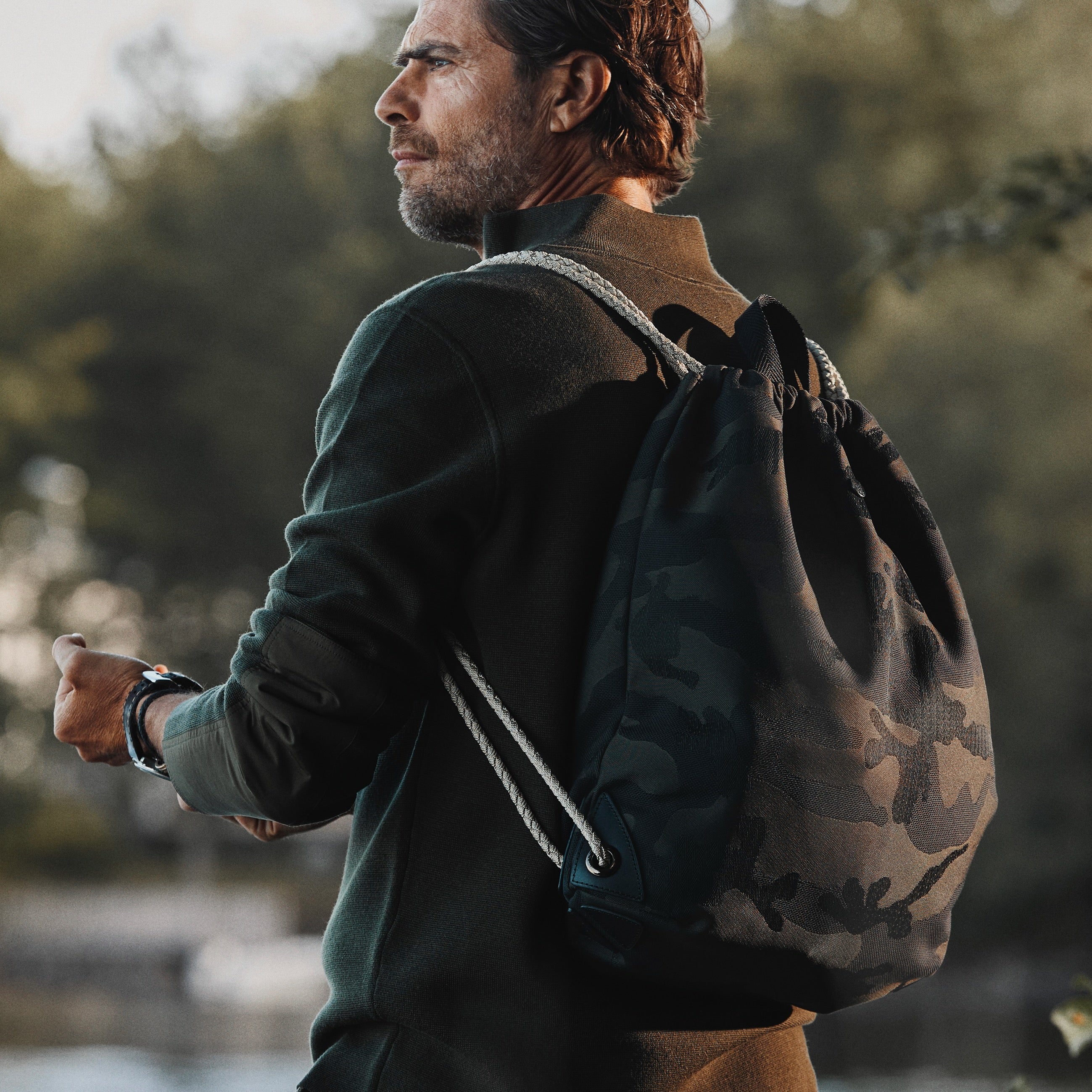 The M/S Drawstring is one of those cherished styles we simply love designing. Thousands of its predecessors pay testimony to its basic usability, so a style like this is all about refinement. Strong camo jacquard for expression and functionality, nylon sailor rope, handle ribbons in sturdy nylon, and everlasting gun-metal eyelets – everything sourced from Italy’s best suppliers in their fields.